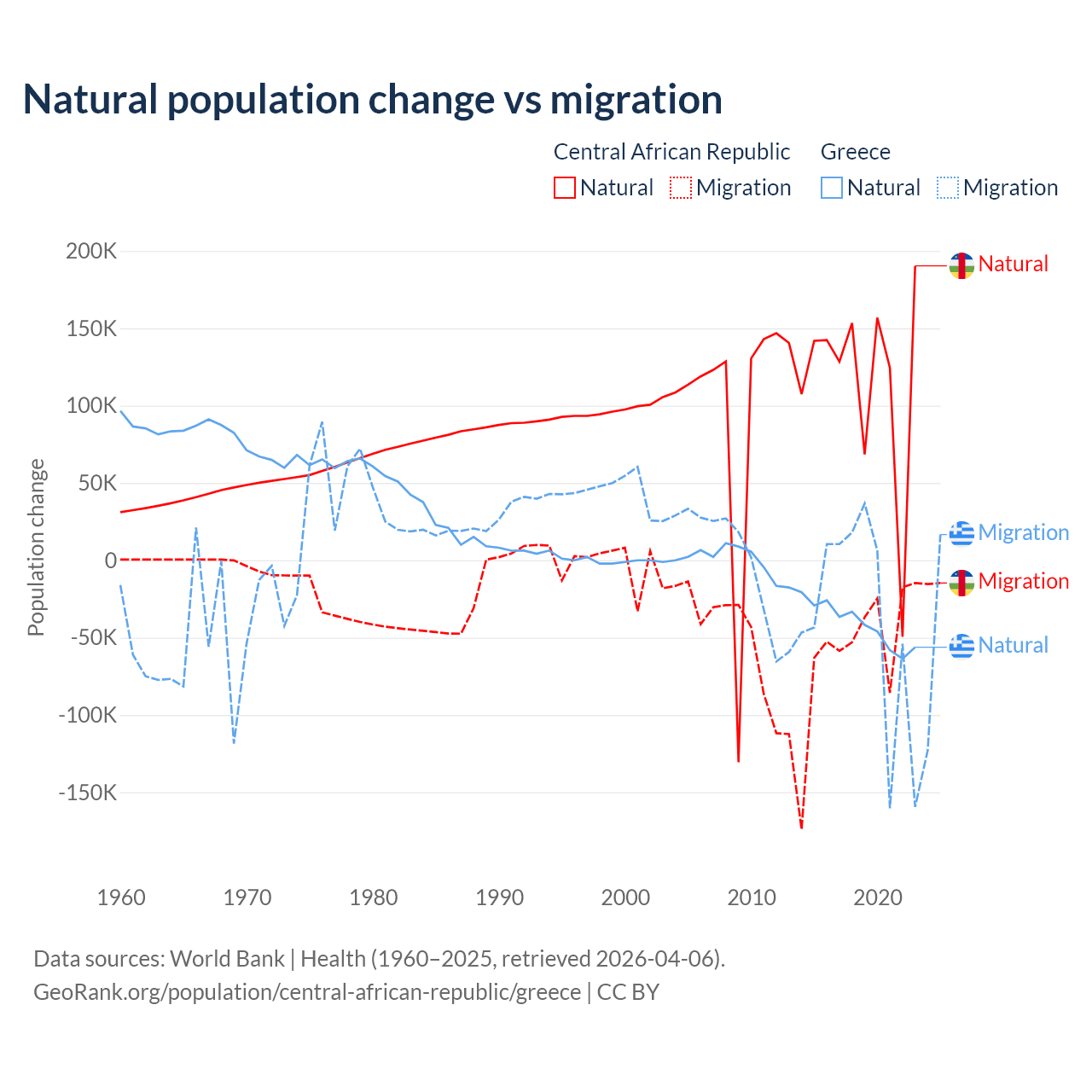 Over the last 10 years, 66.7% of the population change in the Central African Republic is from natural causes (a gain of 1,164,312 people) and 33.3% is from migration (a loss of 580,593 people). In Greece 51.9% is from natural causes (a loss of 411,426 people) and 48.1% is from migration (a loss of 381,824 people).