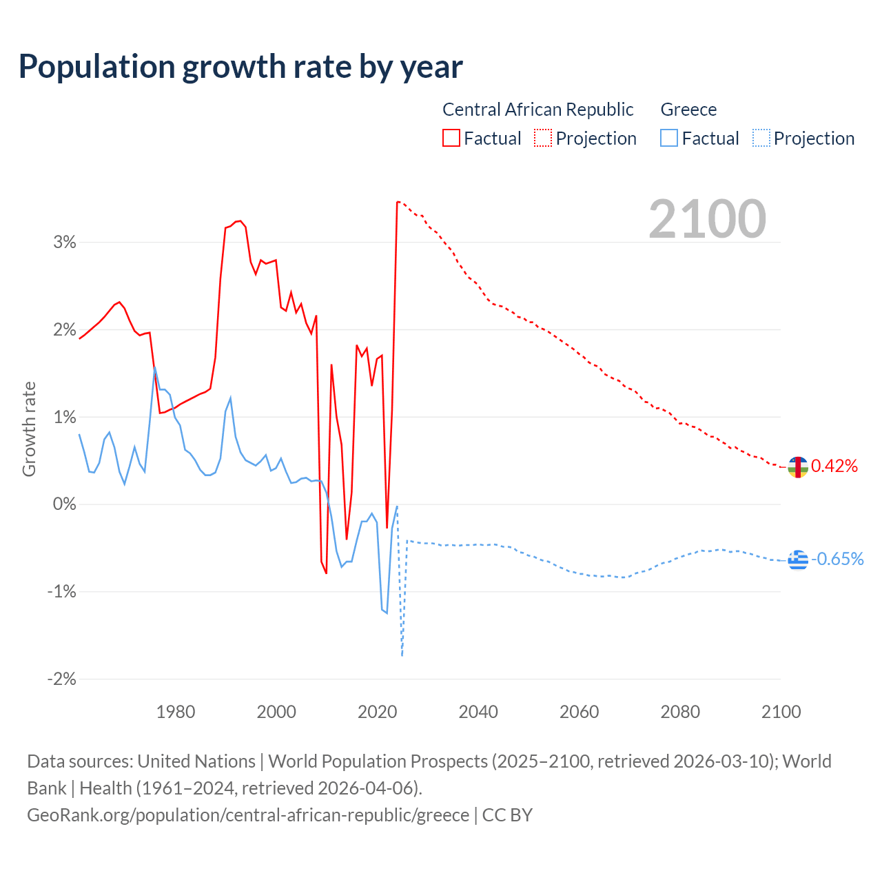Data sources: World Bank | Health (1960–2024, retrieved 2026-04-06); United Nations | World Population Prospects (1960–2026, retrieved 2026-03-10); U.S. Census Bureau (1960–2025, retrieved 2026-02-08); Central Intelligence Agency (CIA) (2000–2019, retrieved 2026-02-20).