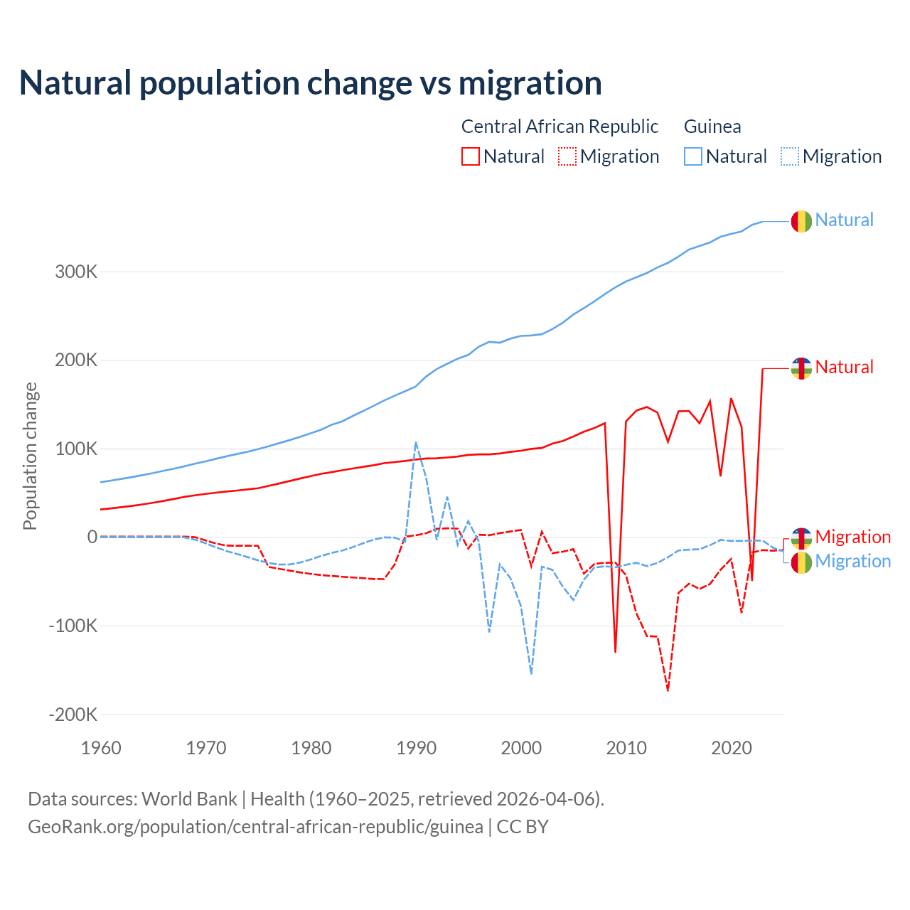 Over the last 10 years, 66.7% of the population change in the Central African Republic is from natural causes (a gain of 1,164,312 people) and 33.3% is from migration (a loss of 580,593 people). In Guinea 97.2% is from natural causes (a gain of 3,346,936 people) and 2.76% is from migration (a loss of 94,924 people).
