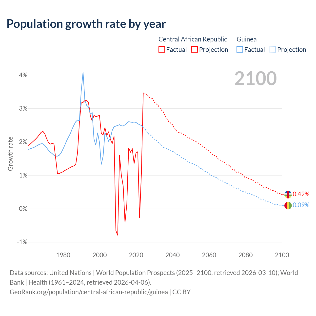 - For the last 10 years, the Central African Republic has had an average growth rate of +1.27% per year vs +2.54% in Guinea.