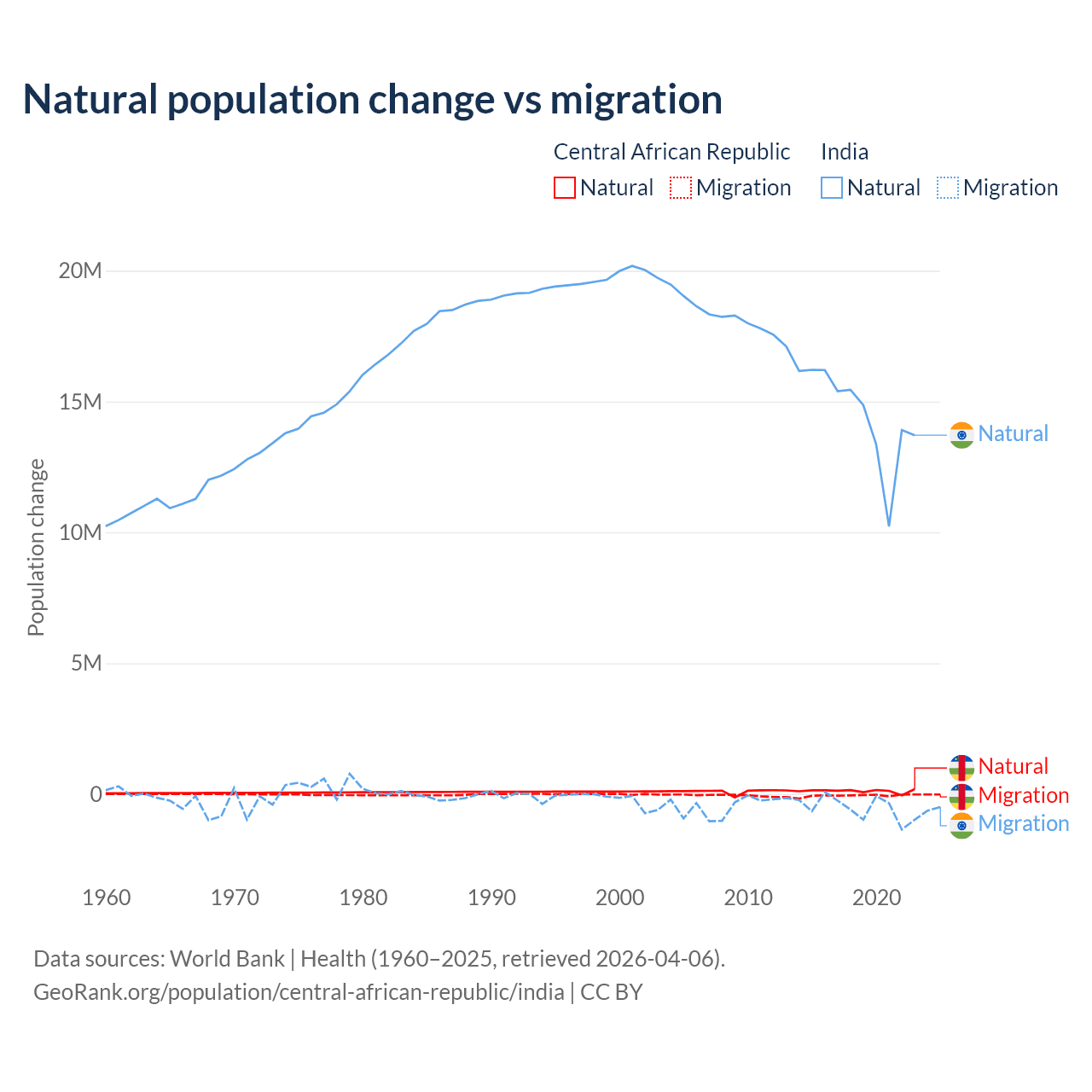 Over the last 10 years, 66.7% of the population change in the Central African Republic is from natural causes (a gain of 1,164,312 people) and 33.3% is from migration (a loss of 580,593 people). In India 96.4% is from natural causes (a gain of 145,503,378 people) and 3.56% is from migration (a loss of 5,376,884 people).
