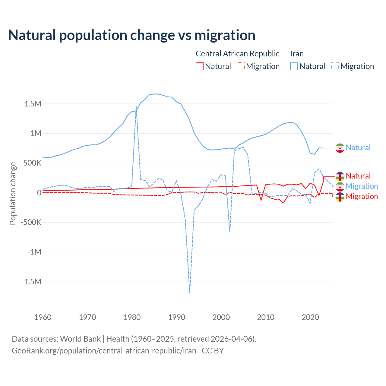 Over the last 10 years, 66.7% of the population change in the Central African Republic is from natural causes (a gain of 1,164,312 people) and 33.3% is from migration (a loss of 580,593 people). In Iran 92.5% is from natural causes (a gain of 9,405,860 people) and 7.46% is from migration (a gain of 757,979 people).
