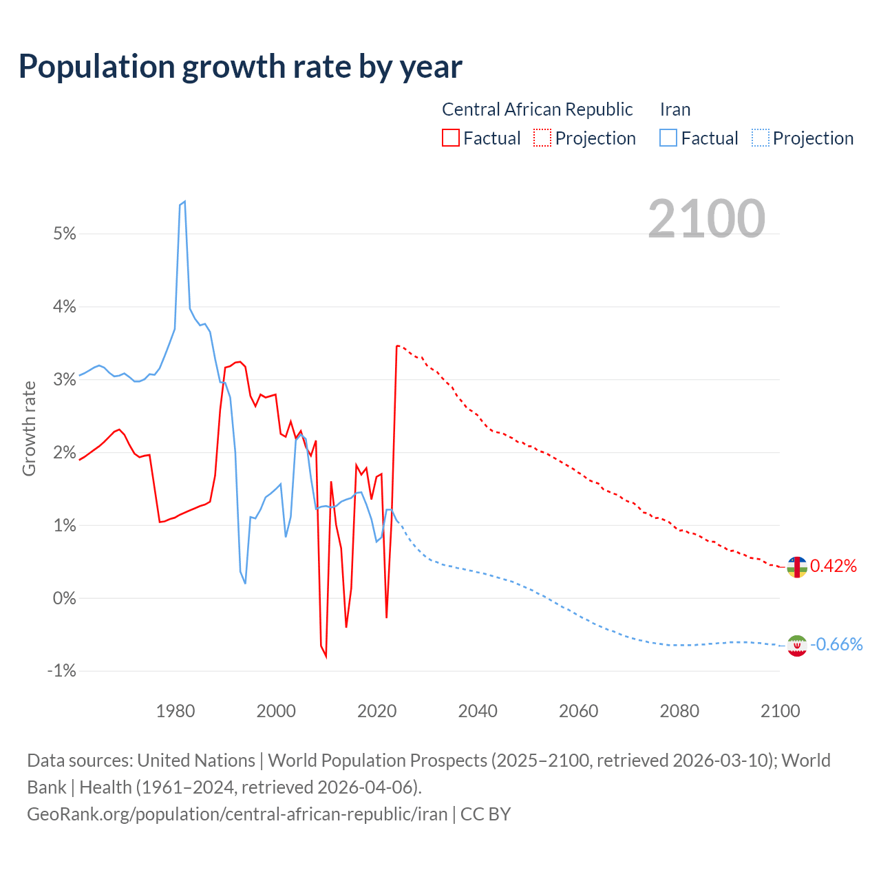 - For the last 10 years, the Central African Republic has had an average growth rate of +1.27% per year vs +1.19% in Iran.