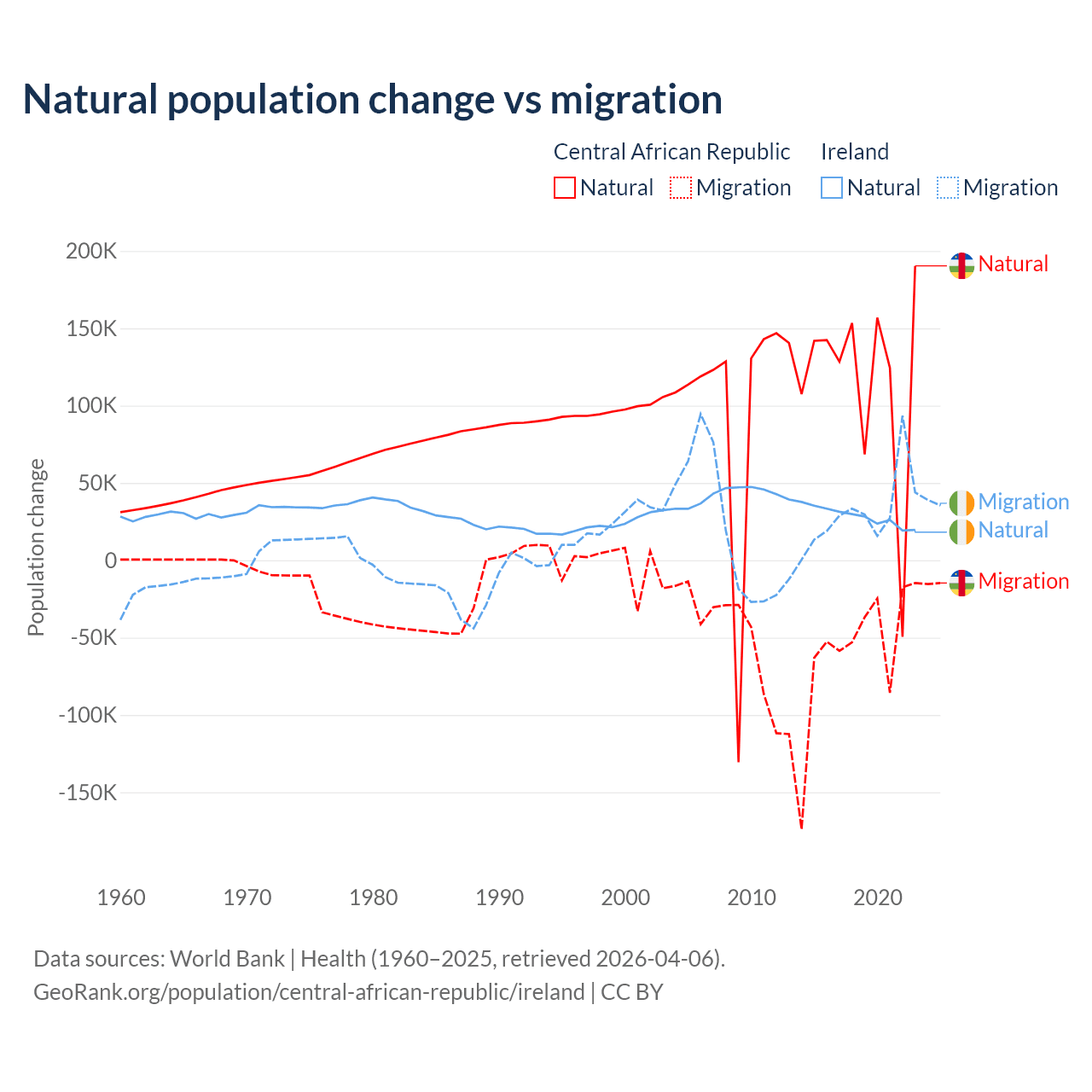 Over the last 10 years, 66.7% of the population change in the Central African Republic is from natural causes (a gain of 1,164,312 people) and 33.3% is from migration (a loss of 580,593 people). In Ireland 48.2% is from natural causes (a gain of 284,644 people) and 51.8% is from migration (a gain of 305,297 people).