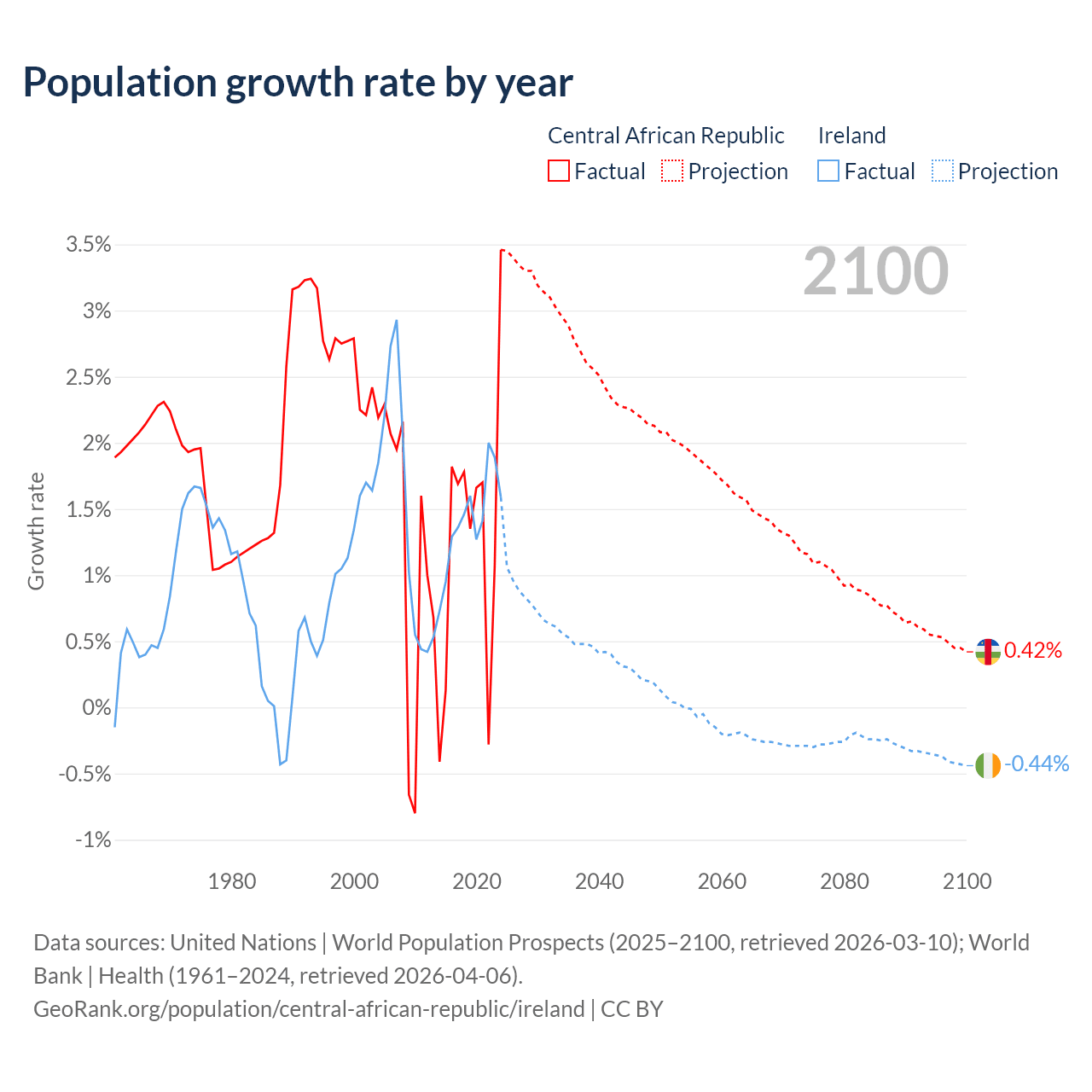 - For the last 10 years, the Central African Republic has had an average growth rate of +1.27% per year vs +1.41% in Ireland.