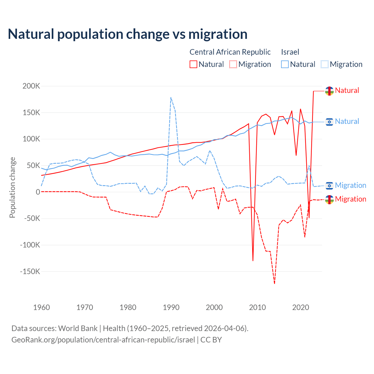 Over the last 10 years, 66.7% of the population change in the Central African Republic is from natural causes (a gain of 1,164,312 people) and 33.3% is from migration (a loss of 580,593 people). In Israel 86% is from natural causes (a gain of 1,343,492 people) and 14% is from migration (a gain of 219,048 people).