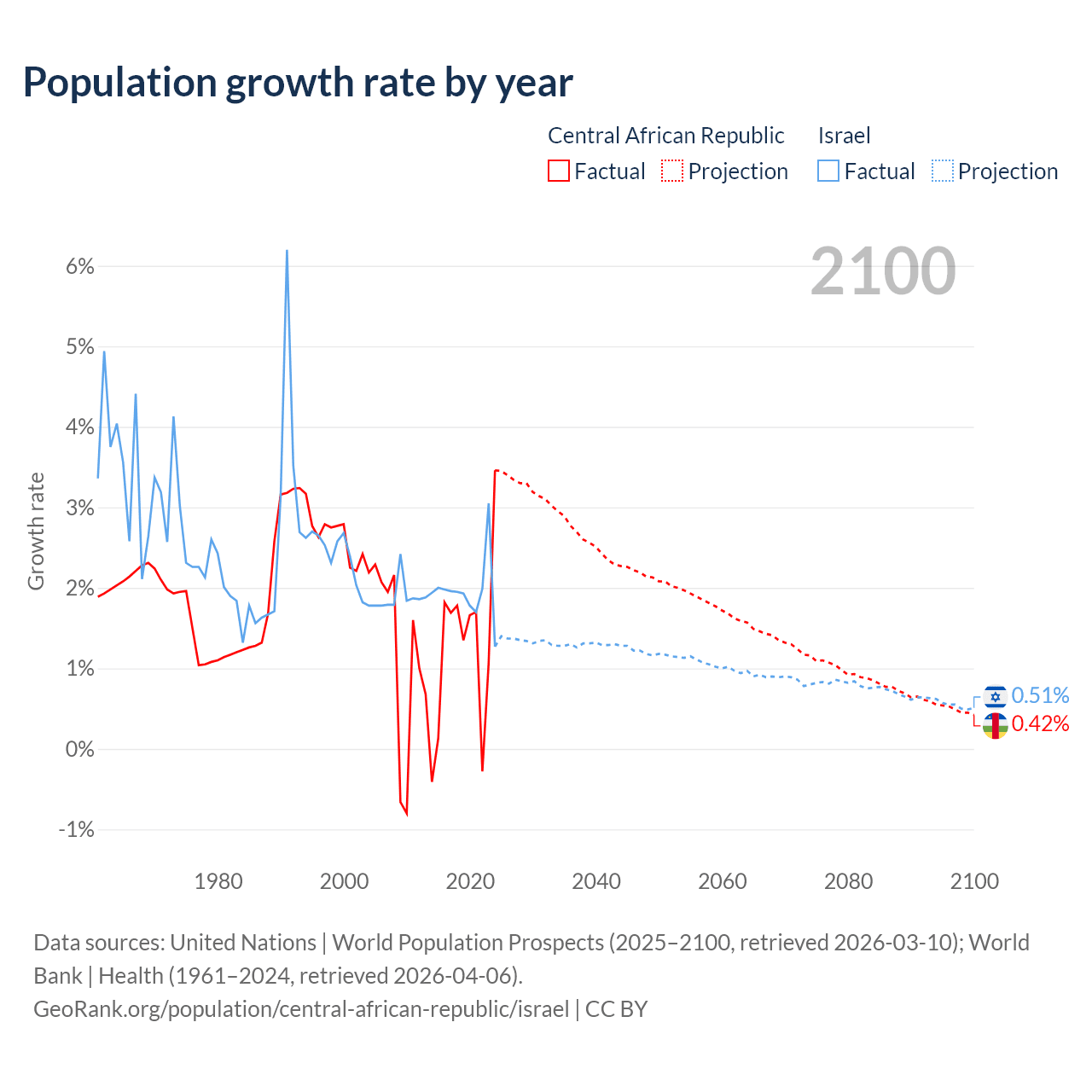 - For the last 10 years, the Central African Republic has had an average growth rate of +1.27% per year vs +1.96% in Israel.