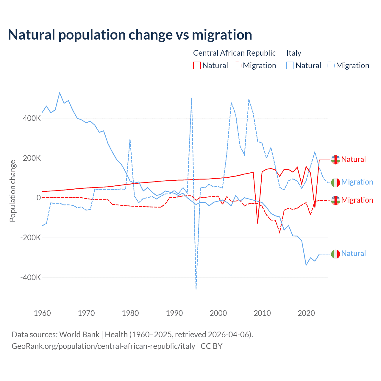 Over the last 10 years, 66.7% of the population change in the Central African Republic is from natural causes (a gain of 1,164,312 people) and 33.3% is from migration (a loss of 580,593 people). In Italy 68.6% is from natural causes (a loss of 2,239,084 people) and 31.4% is from migration (a gain of 1,026,128 people).