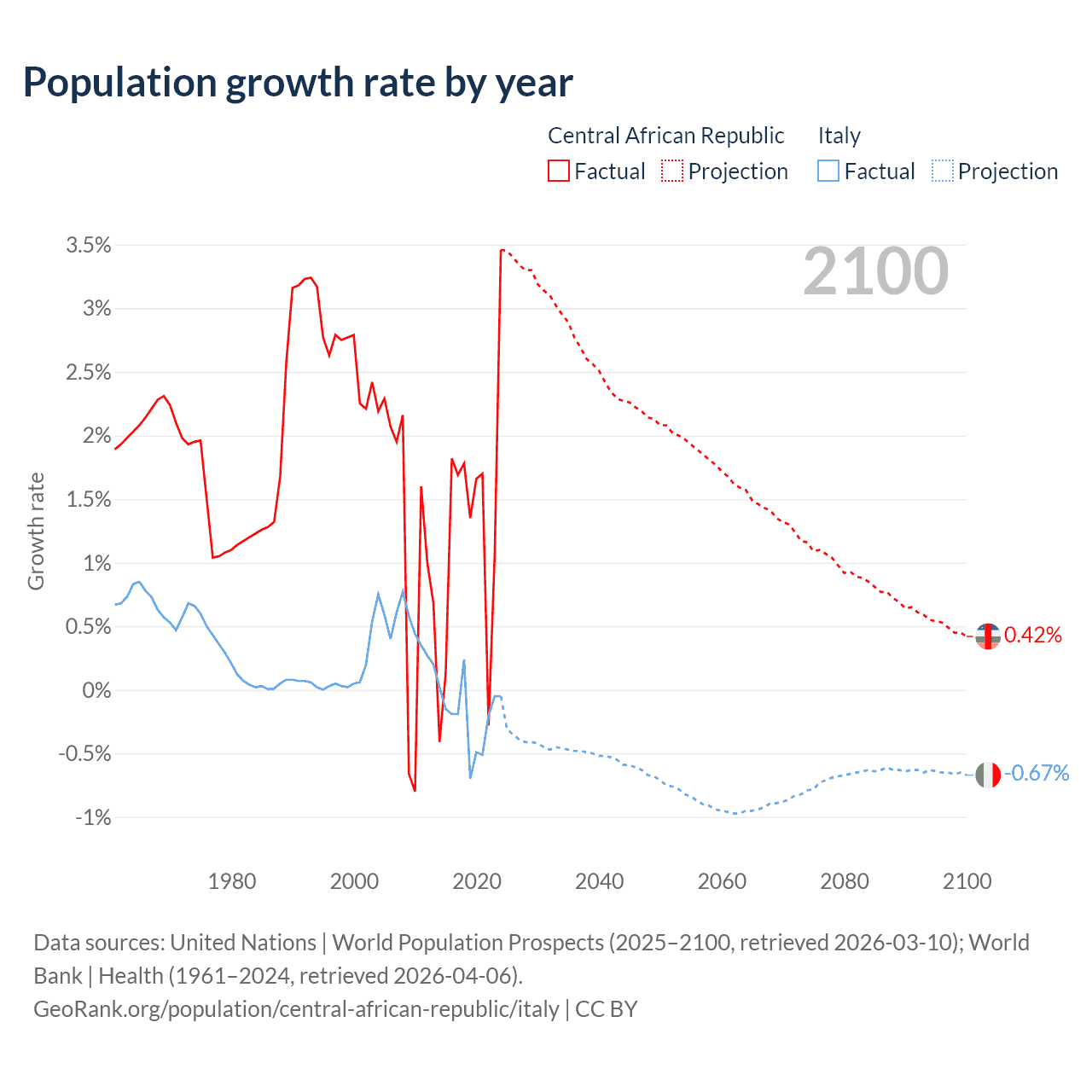 - For the last 10 years, the Central African Republic has had an average growth rate of +1.27% per year vs -0.21% in Italy.