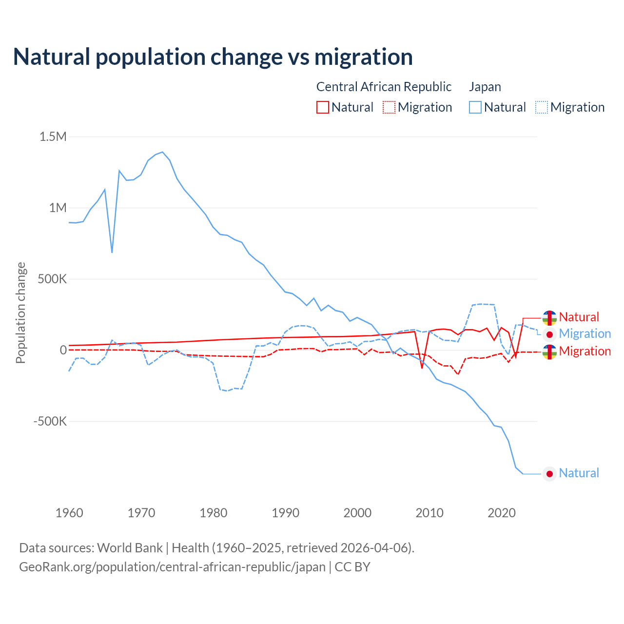 Over the last 10 years, 66.7% of the population change in the Central African Republic is from natural causes (a gain of 1,164,312 people) and 33.3% is from migration (a loss of 580,593 people). In Japan 73.6% is from natural causes (a loss of 5,178,838 people) and 26.4% is from migration (a gain of 1,860,103 people).