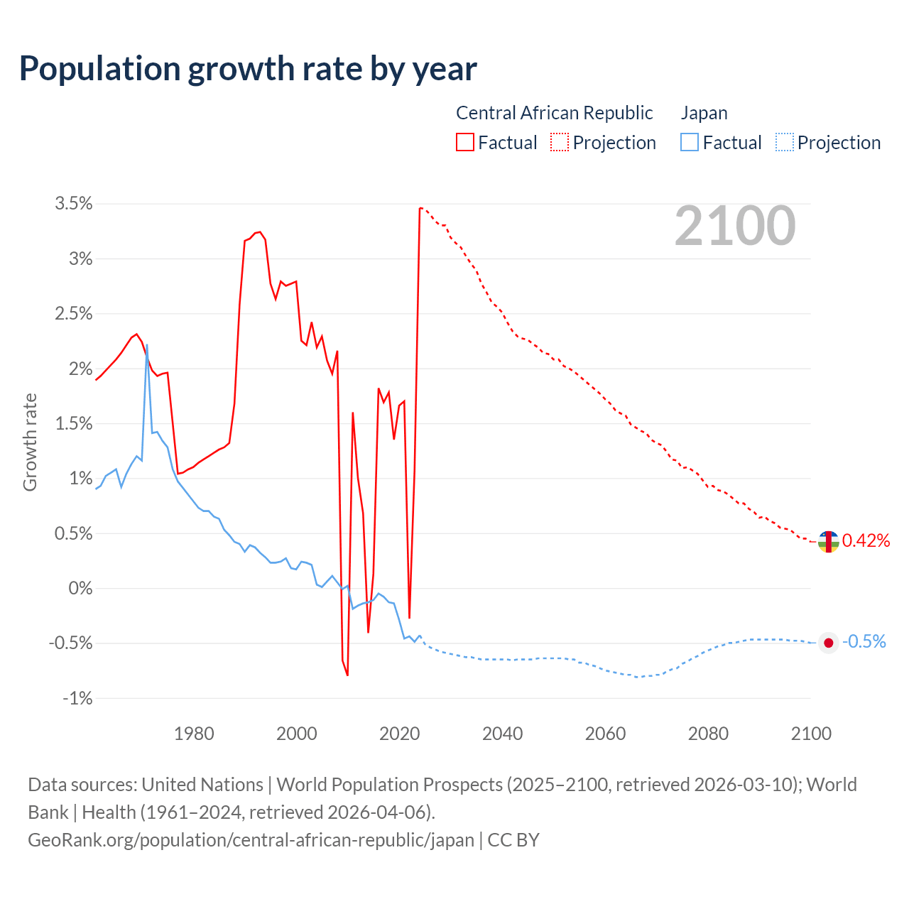 - For the last 10 years, the Central African Republic has had an average growth rate of +1.27% per year vs -0.25% in Japan.