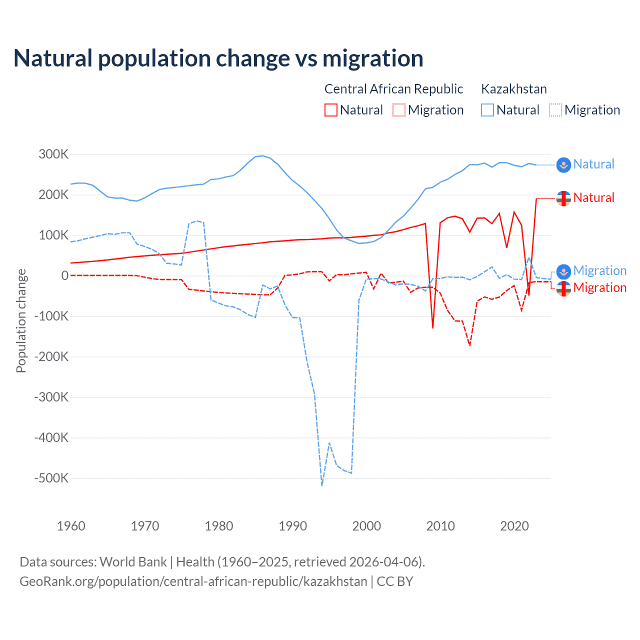 Over the last 10 years, 66.7% of the population change in the Central African Republic is from natural causes (a gain of 1,164,312 people) and 33.3% is from migration (a loss of 580,593 people). In Kazakhstan 98.7% is from natural causes (a gain of 2,743,094 people) and 1.33% is from migration (a gain of 36,908 people).