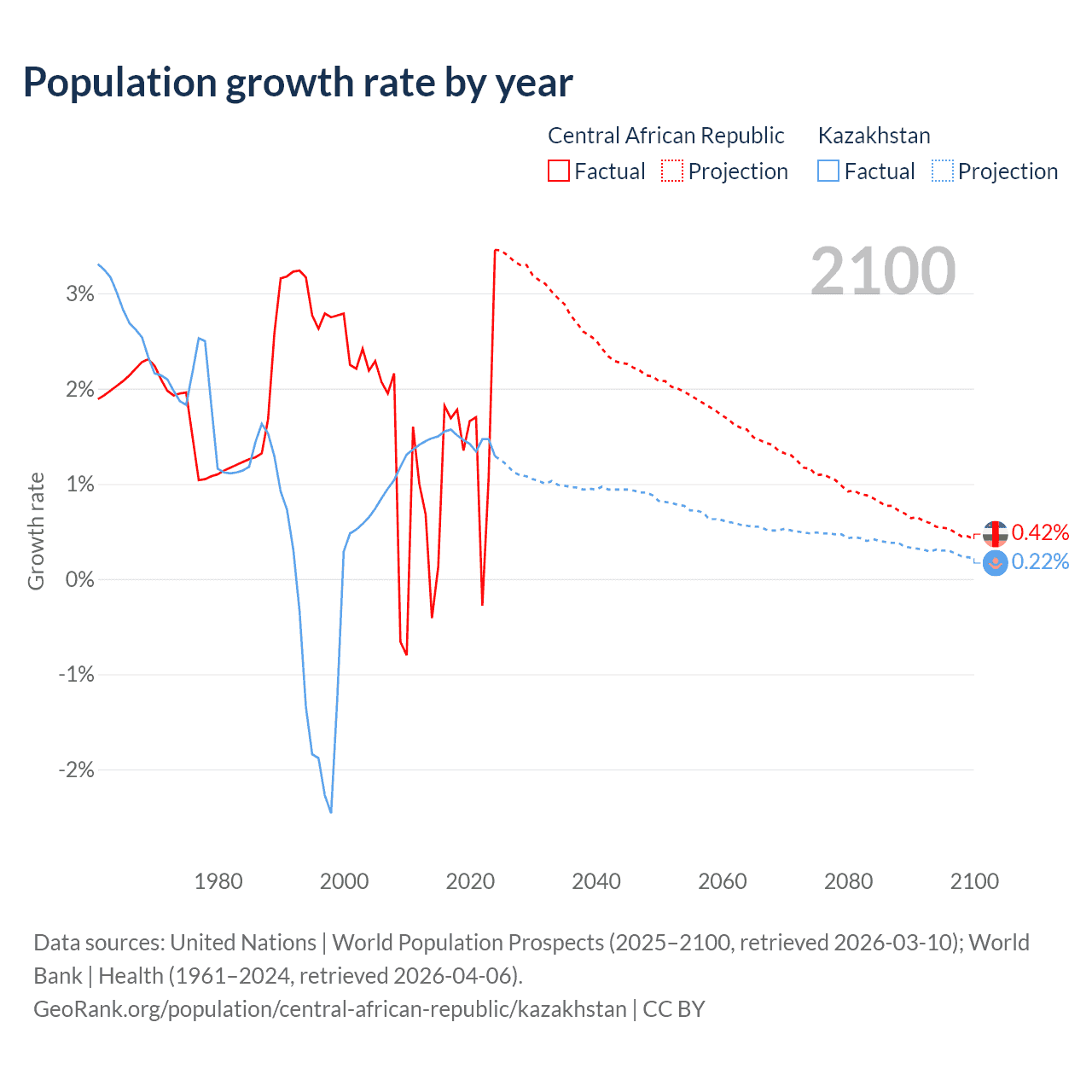 Data sources: World Bank | Health (1960–2024, retrieved 2026-04-06); United Nations | World Population Prospects (1960–2026, retrieved 2026-03-10); U.S. Census Bureau (1960–2025, retrieved 2026-02-08); Central Intelligence Agency (CIA) (2000–2019, retrieved 2026-02-20).
