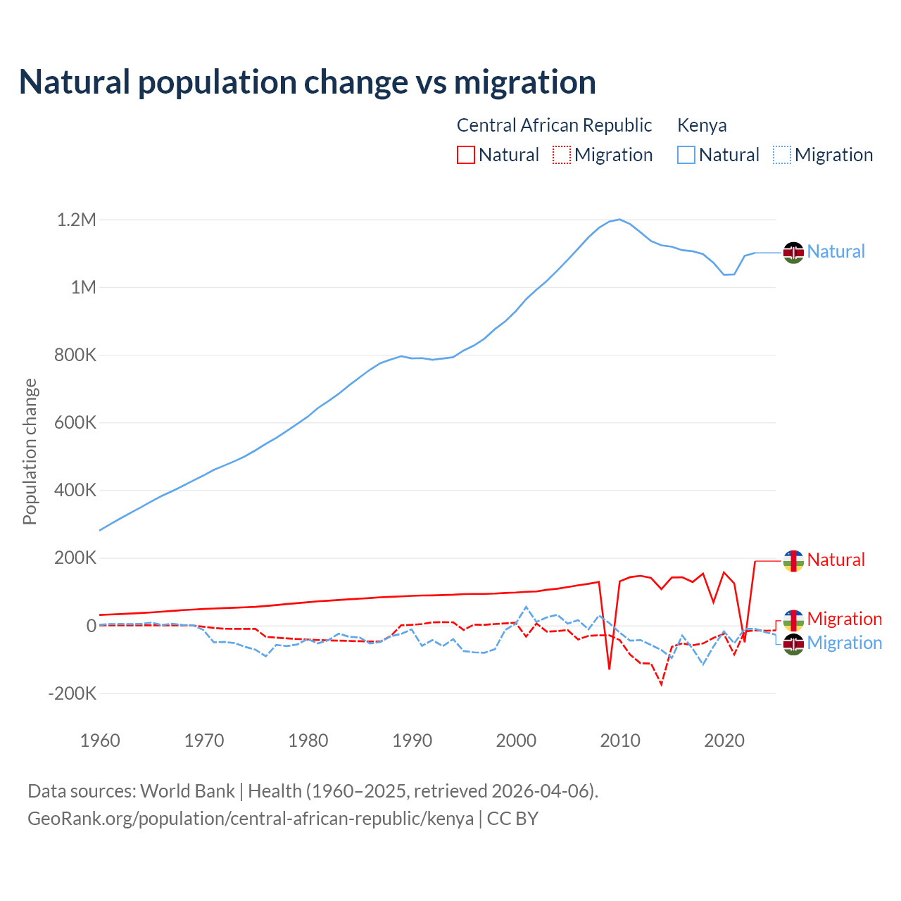 Over the last 10 years, 66.7% of the population change in the Central African Republic is from natural causes (a gain of 1,164,312 people) and 33.3% is from migration (a loss of 580,593 people). In Kenya 95.3% is from natural causes (a gain of 10,892,362 people) and 4.67% is from migration (a loss of 533,876 people).