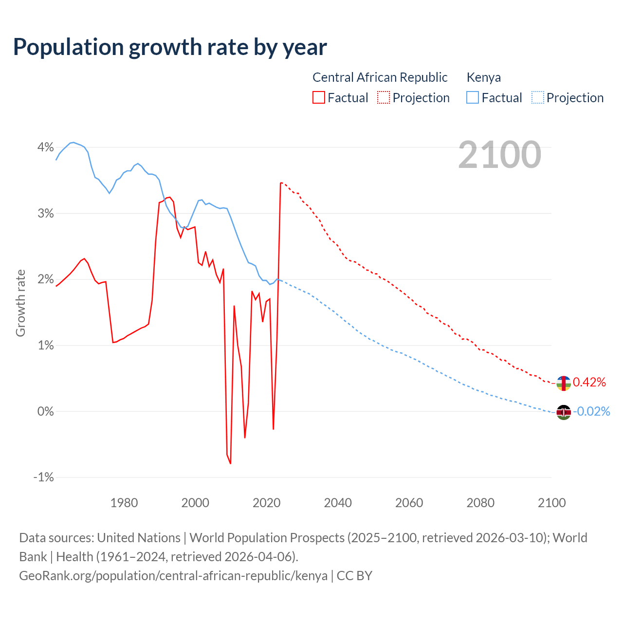 - For the last 10 years, the Central African Republic has had an average growth rate of +1.27% per year vs +2.08% in Kenya.