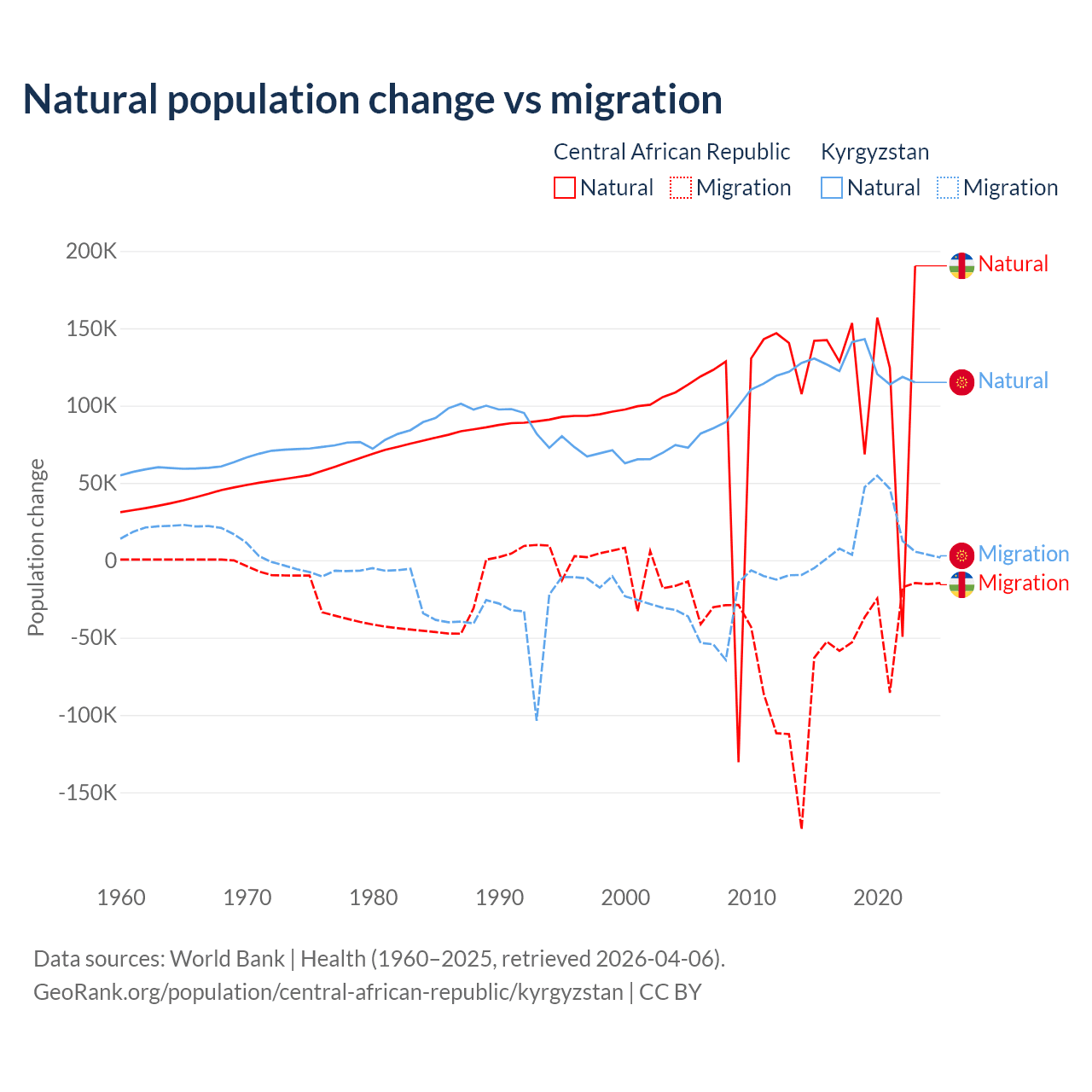 Over the last 10 years, 66.7% of the population change in the Central African Republic is from natural causes (a gain of 1,164,312 people) and 33.3% is from migration (a loss of 580,593 people). In Kyrgyzstan 88.5% is from natural causes (a gain of 1,258,837 people) and 11.5% is from migration (a gain of 164,132 people).