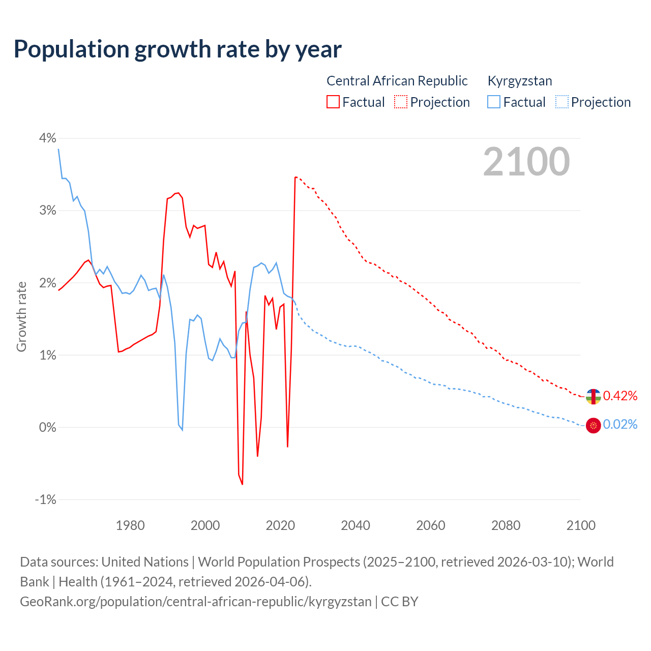 - For the last 10 years, the Central African Republic has had an average growth rate of +1.27% per year vs +2.05% in Kyrgyzstan.