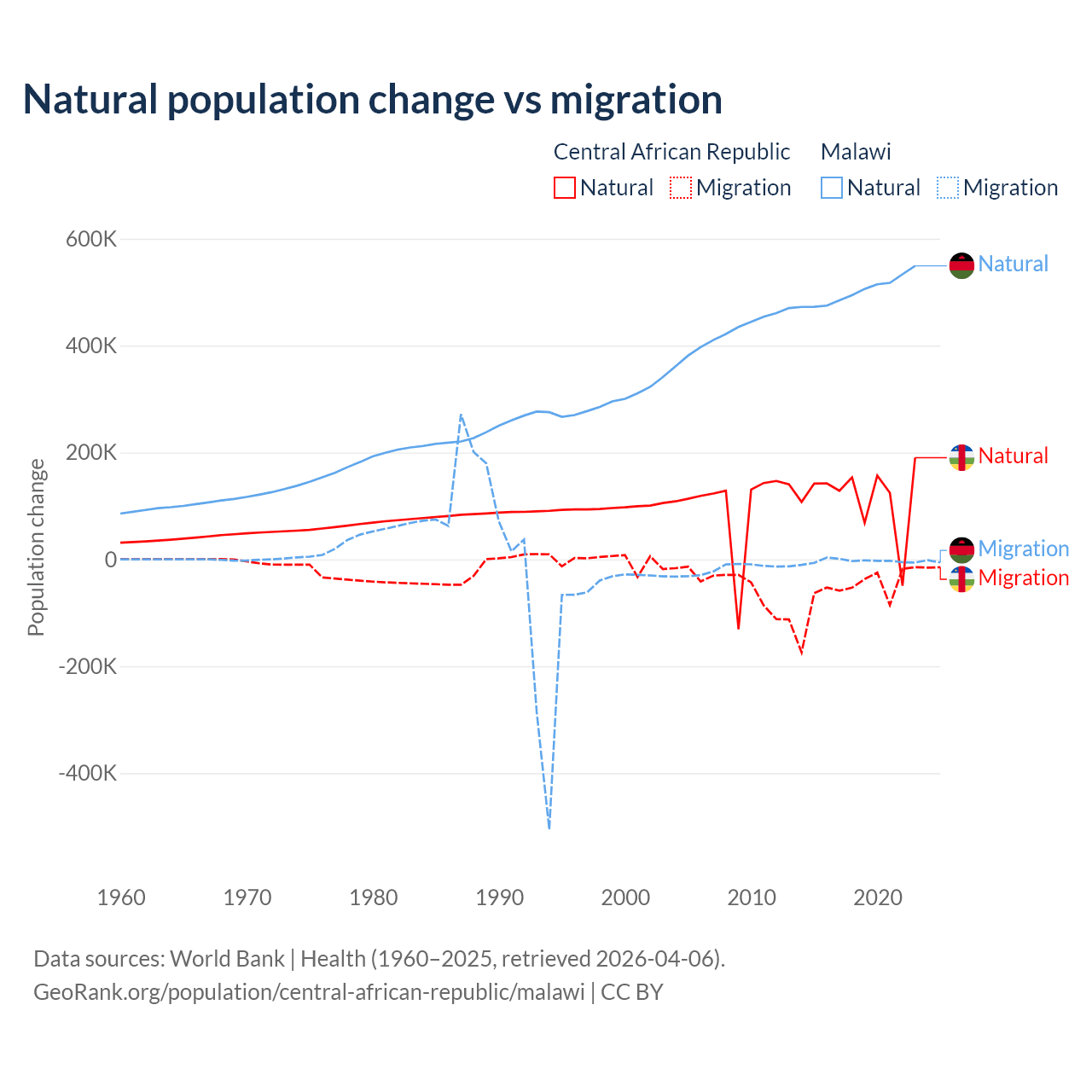Over the last 10 years, 66.7% of the population change in the Central African Republic is from natural causes (a gain of 1,164,312 people) and 33.3% is from migration (a loss of 580,593 people). In Malawi 99.3% is from natural causes (a gain of 5,019,393 people) and 0.67% is from migration (a loss of 33,768 people).
