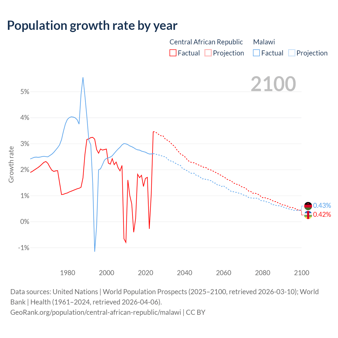 - For the last 10 years, the Central African Republic has had an average growth rate of +1.27% per year vs +2.7% in Malawi.