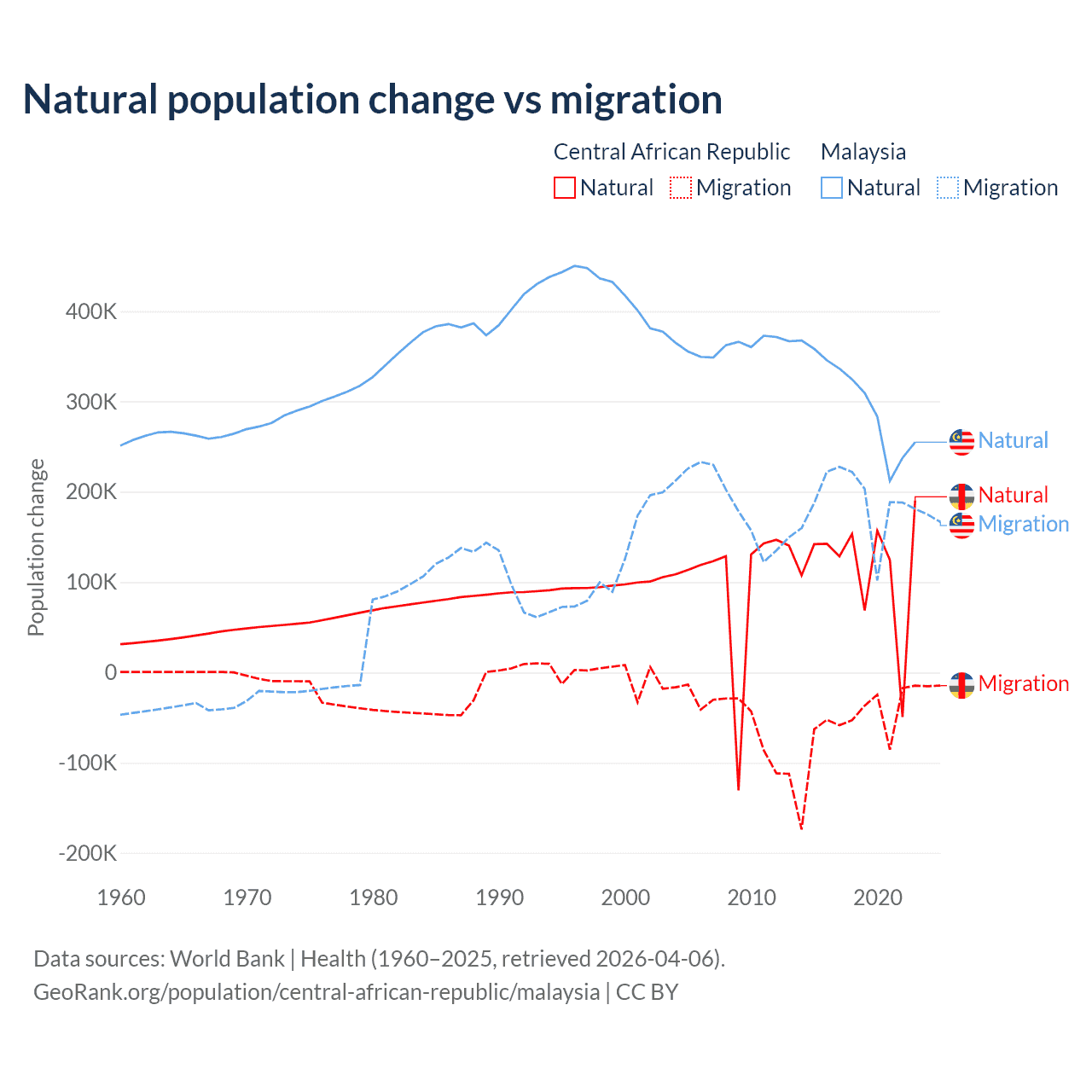 Over the last 10 years, 66.7% of the population change in the Central African Republic is from natural causes (a gain of 1,164,312 people) and 33.3% is from migration (a loss of 580,593 people). In Malaysia 61.7% is from natural causes (a gain of 3,029,648 people) and 38.3% is from migration (a gain of 1,882,159 people).