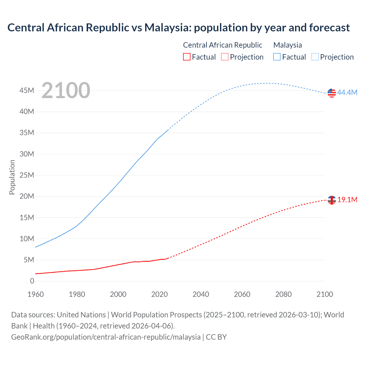 Central African Republic vs Malaysia: population by year and forecast