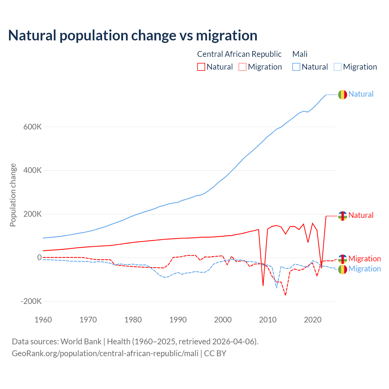 Over the last 10 years, 66.7% of the population change in the Central African Republic is from natural causes (a gain of 1,164,312 people) and 33.3% is from migration (a loss of 580,593 people). In Mali 94.9% is from natural causes (a gain of 6,749,473 people) and 5.13% is from migration (a loss of 365,292 people).