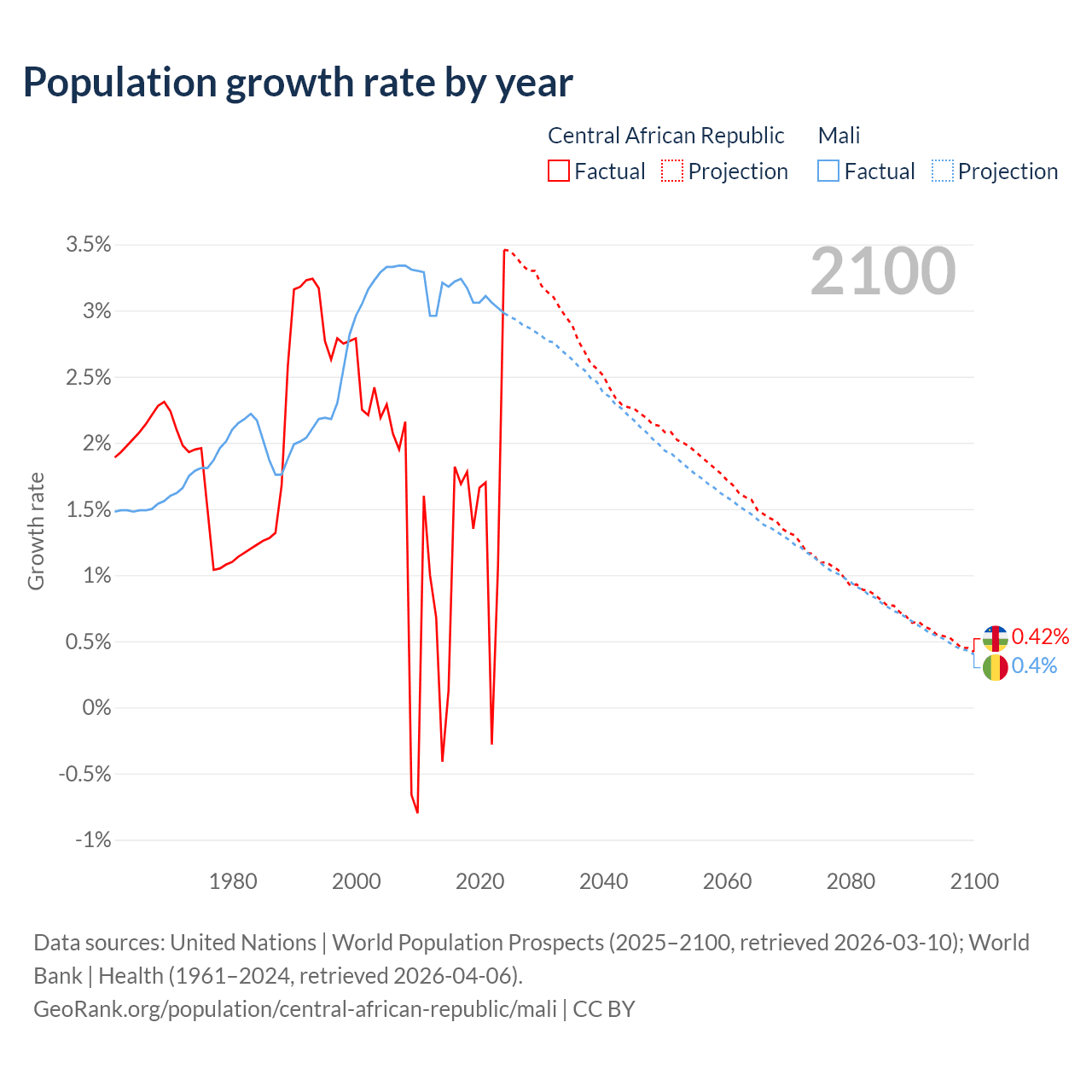 - For the last 10 years, the Central African Republic has had an average growth rate of +1.27% per year vs +3.12% in Mali.
