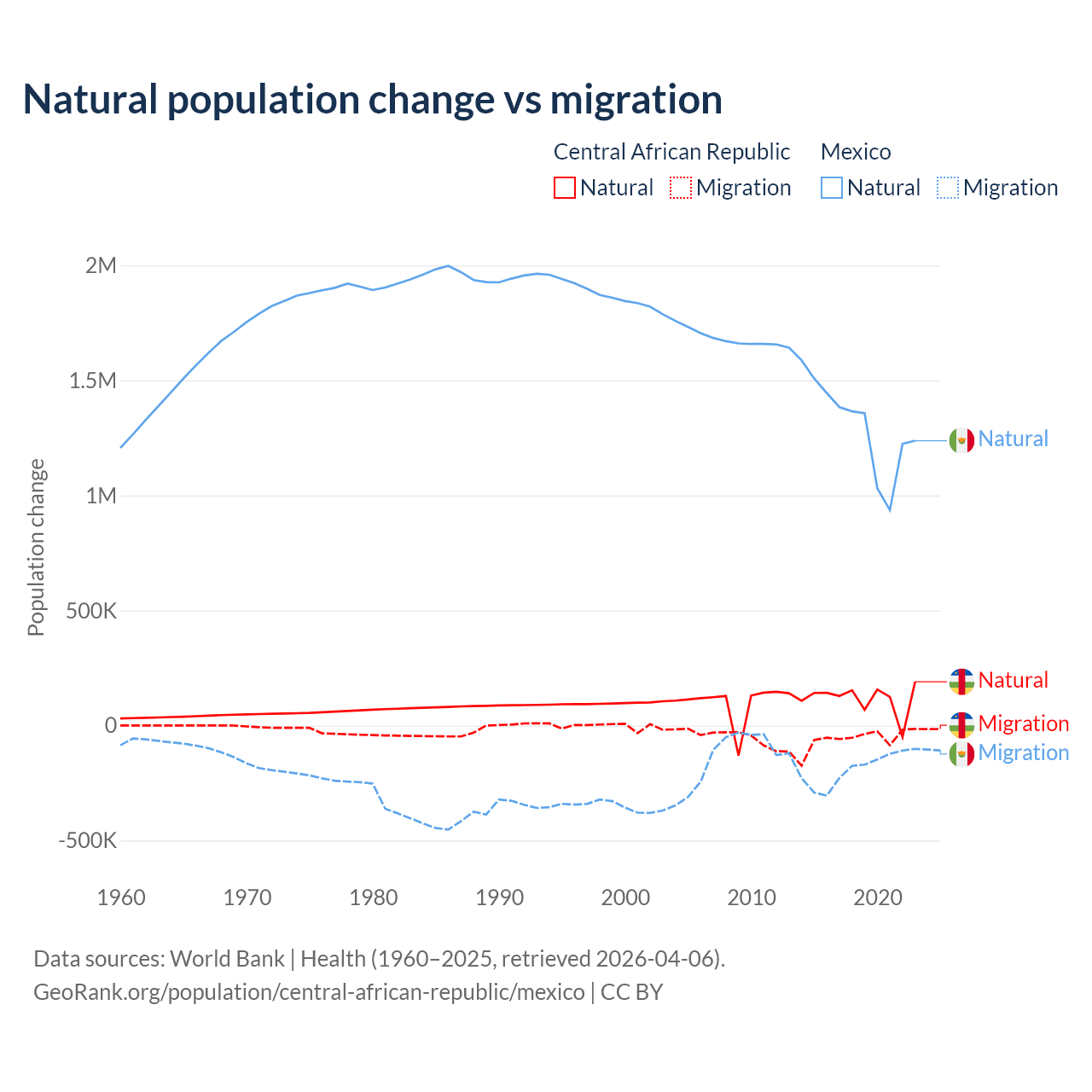 Over the last 10 years, 66.7% of the population change in the Central African Republic is from natural causes (a gain of 1,164,312 people) and 33.3% is from migration (a loss of 580,593 people). In Mexico 87.5% is from natural causes (a gain of 13,080,136 people) and 12.5% is from migration (a loss of 1,876,544 people).