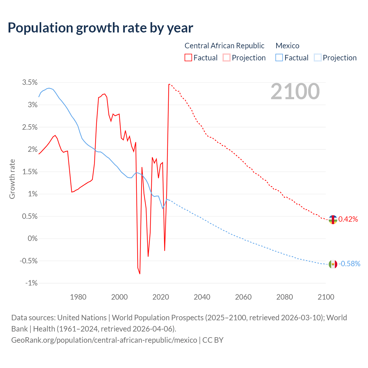 Data sources: World Bank | Health (1960–2024, retrieved 2026-04-06); United Nations | World Population Prospects (1960–2026, retrieved 2026-03-10); U.S. Census Bureau (1960–2025, retrieved 2026-02-08); Central Intelligence Agency (CIA) (2000–2019, retrieved 2026-02-20).