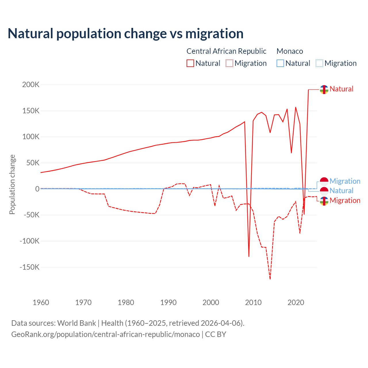 Over the last 10 years, 66.7% of the population change in the Central African Republic is from natural causes (a gain of 1,164,312 people) and 33.3% is from migration (a loss of 580,593 people). In Monaco 37.3% is from natural causes (a loss of 4,357 people) and 62.7% is from migration (a gain of 7,333 people).