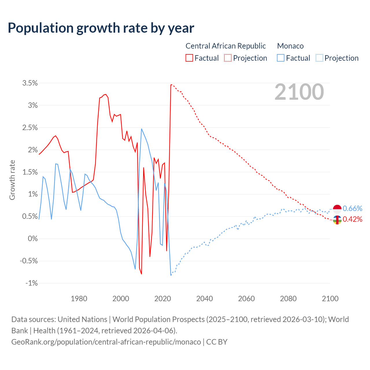 Data sources: World Bank | Health (1960–2024, retrieved 2026-04-06); United Nations | World Population Prospects (1960–2026, retrieved 2026-03-10); U.S. Census Bureau (1960–2025, retrieved 2026-02-08); Central Intelligence Agency (CIA) (2000–2019, retrieved 2026-02-20).