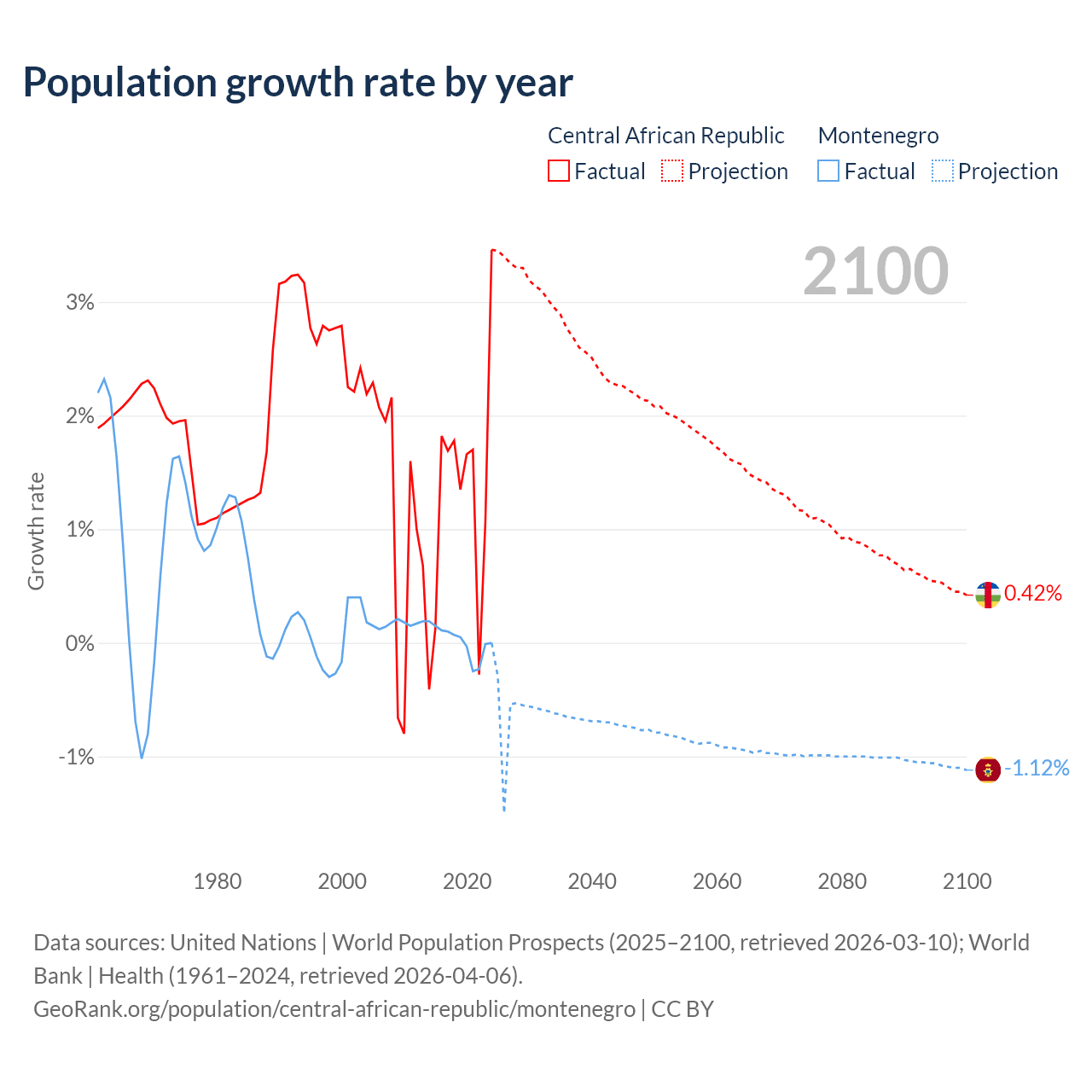 - For the last 10 years, the Central African Republic has had an average growth rate of +1.27% per year vs +0.01% in Montenegro.