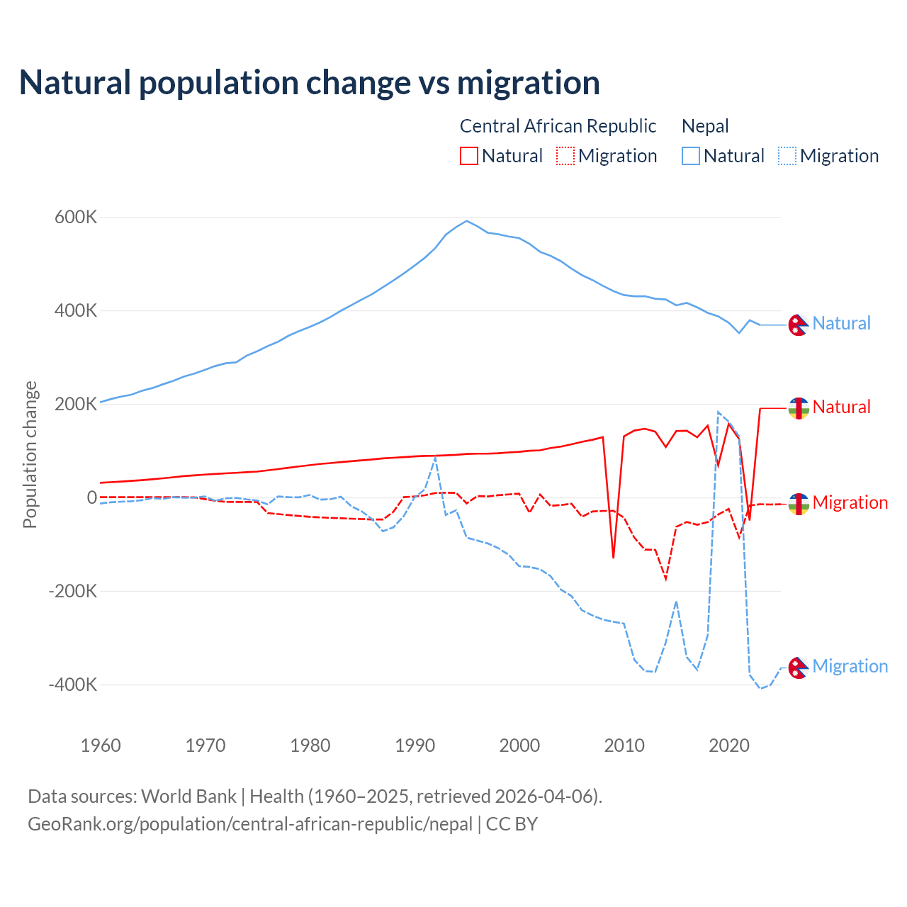 Over the last 10 years, 66.7% of the population change in the Central African Republic is from natural causes (a gain of 1,164,312 people) and 33.3% is from migration (a loss of 580,593 people). In Nepal 67.9% is from natural causes (a gain of 3,909,749 people) and 32.1% is from migration (a loss of 1,851,664 people).