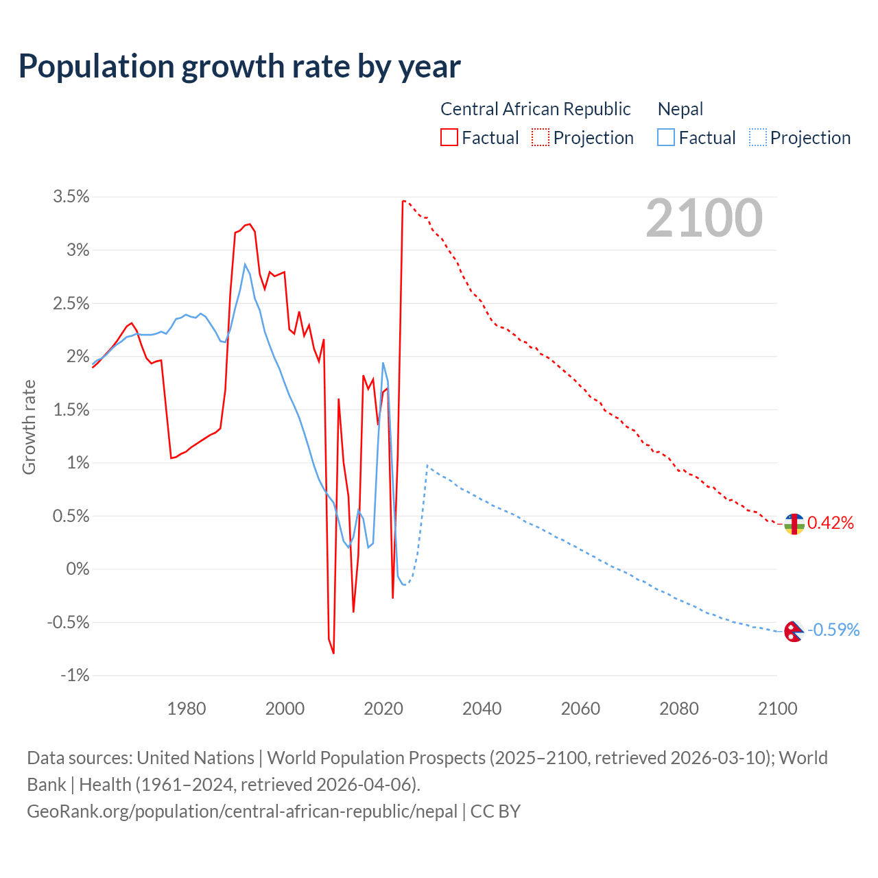 Data sources: World Bank | Health (1960–2024, retrieved 2026-04-06); United Nations | World Population Prospects (1960–2026, retrieved 2026-03-10); U.S. Census Bureau (1960–2025, retrieved 2026-02-08); Central Intelligence Agency (CIA) (2000–2019, retrieved 2026-02-20).