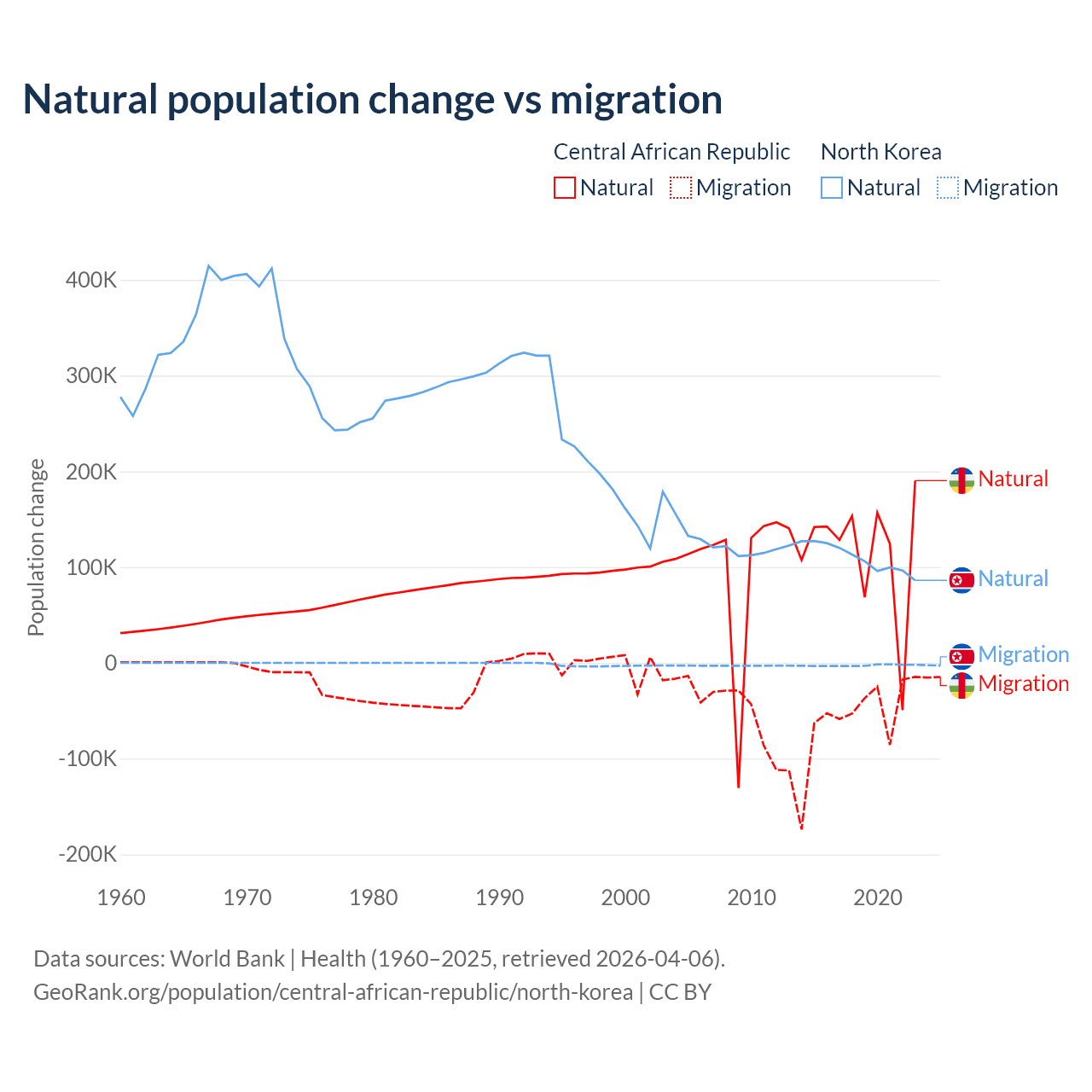 Over the last 10 years, 66.7% of the population change in the Central African Republic is from natural causes (a gain of 1,164,312 people) and 33.3% is from migration (a loss of 580,593 people). In North Korea 97.7% is from natural causes (a gain of 1,097,372 people) and 2.33% is from migration (a loss of 26,227 people).
