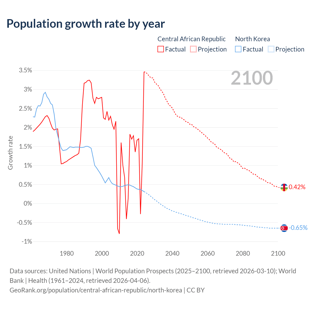Data sources: World Bank | Health (1960–2024, retrieved 2026-04-06); United Nations | World Population Prospects (1960–2026, retrieved 2026-03-10); U.S. Census Bureau (1960–2025, retrieved 2026-02-08); Central Intelligence Agency (CIA) (2000–2019, retrieved 2026-02-20).