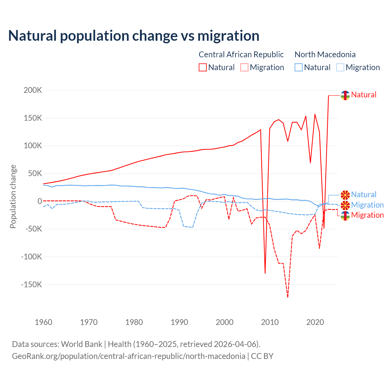 Over the last 10 years, 66.7% of the population change in the Central African Republic is from natural causes (a gain of 1,164,312 people) and 33.3% is from migration (a loss of 580,593 people). In North Macedonia 6.45% is from natural causes (a loss of 12,585 people) and 93.5% is from migration (a loss of 182,429 people).