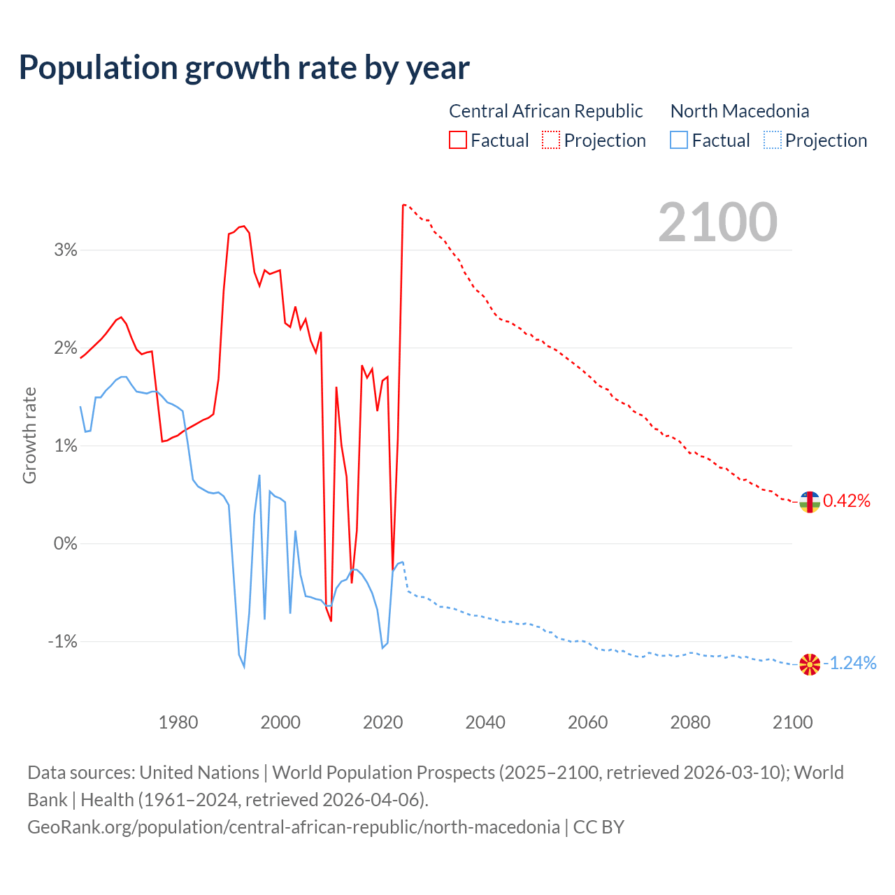 - For the last 10 years, the Central African Republic has had an average growth rate of +1.27% per year vs -0.48% in North Macedonia.