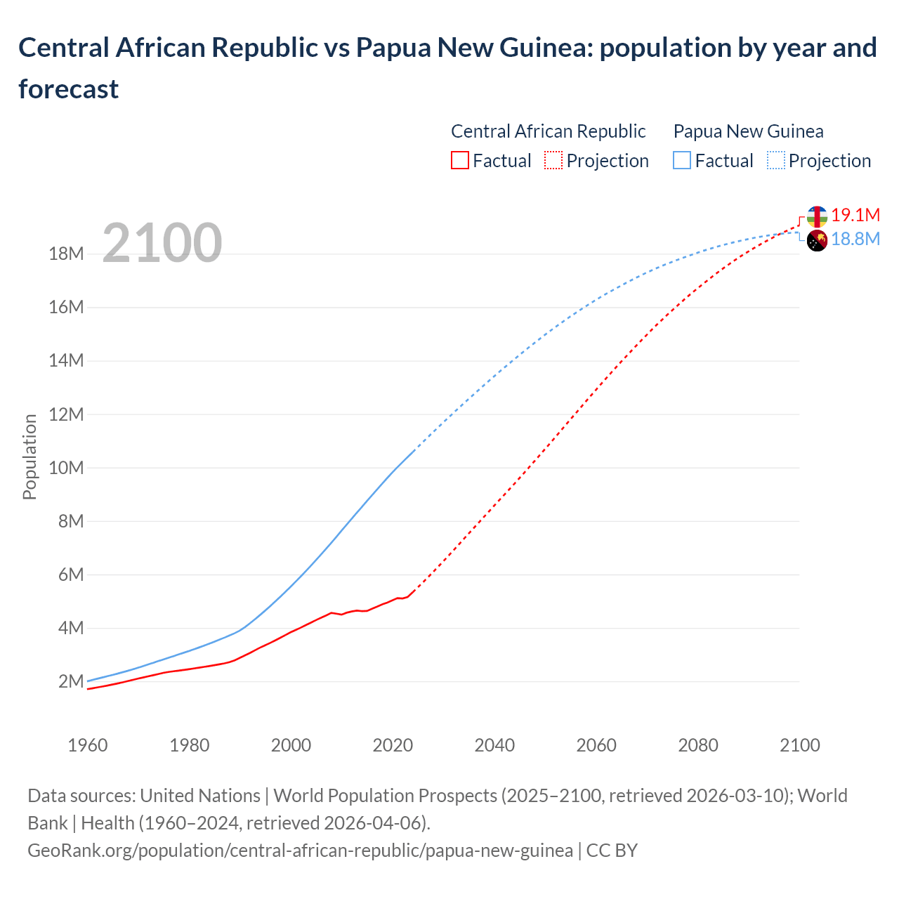 Central African Republic vs Papua New Guinea: population by year and forecast