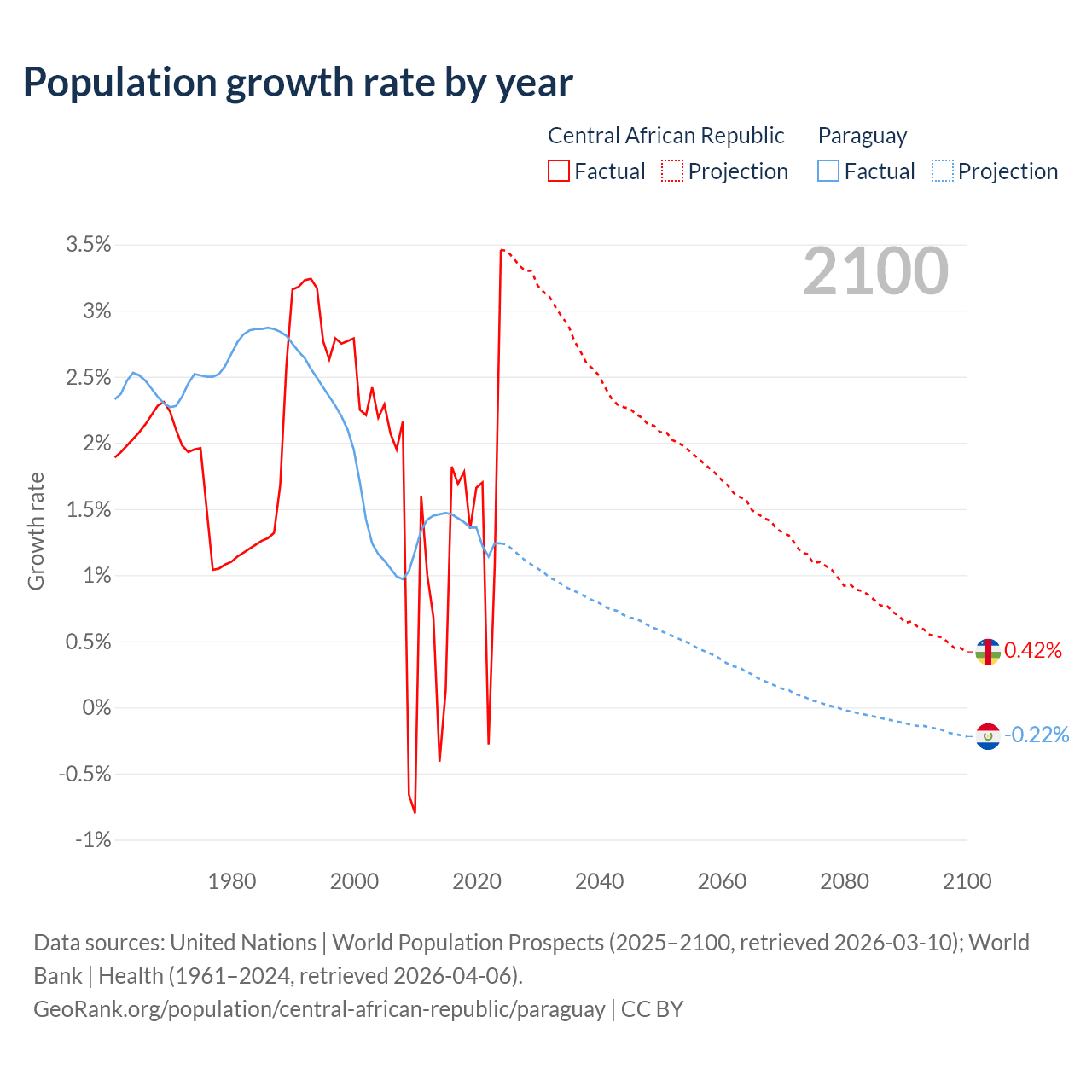 Data sources: World Bank | Health (1960–2024, retrieved 2026-04-06); United Nations | World Population Prospects (1960–2026, retrieved 2026-03-10); U.S. Census Bureau (1960–2025, retrieved 2026-02-08); Central Intelligence Agency (CIA) (2000–2019, retrieved 2026-02-20).