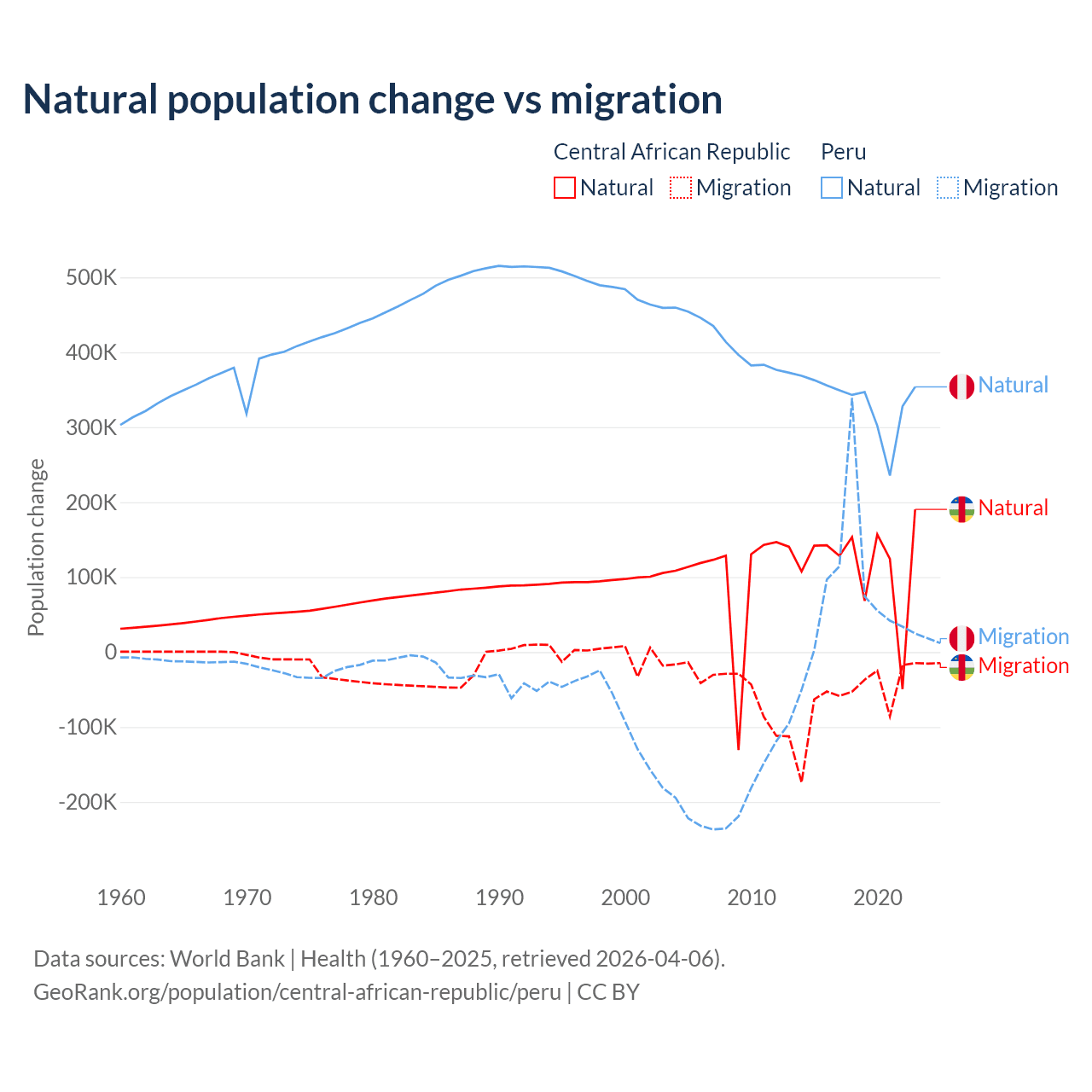 Over the last 10 years, 66.7% of the population change in the Central African Republic is from natural causes (a gain of 1,164,312 people) and 33.3% is from migration (a loss of 580,593 people). In Peru 82% is from natural causes (a gain of 3,345,822 people) and 18% is from migration (a gain of 732,505 people).