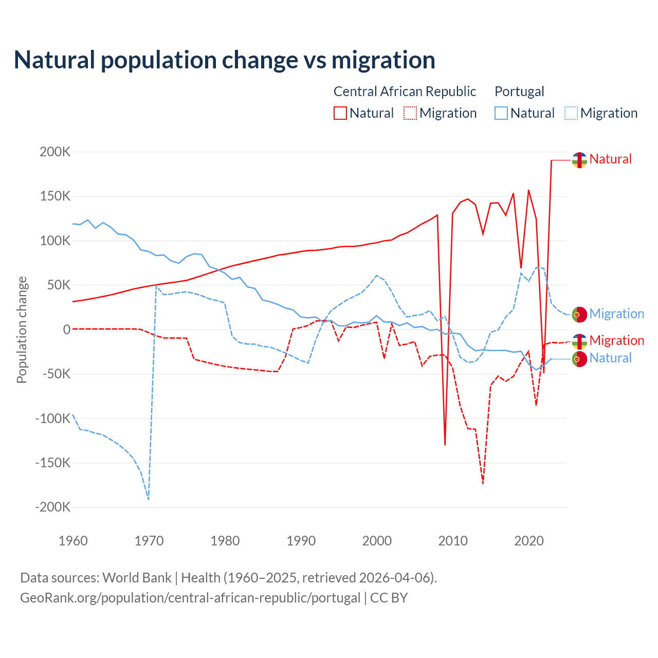 Over the last 10 years, 66.7% of the population change in the Central African Republic is from natural causes (a gain of 1,164,312 people) and 33.3% is from migration (a loss of 580,593 people). In Portugal 51% is from natural causes (a loss of 302,748 people) and 49% is from migration (a gain of 290,554 people).