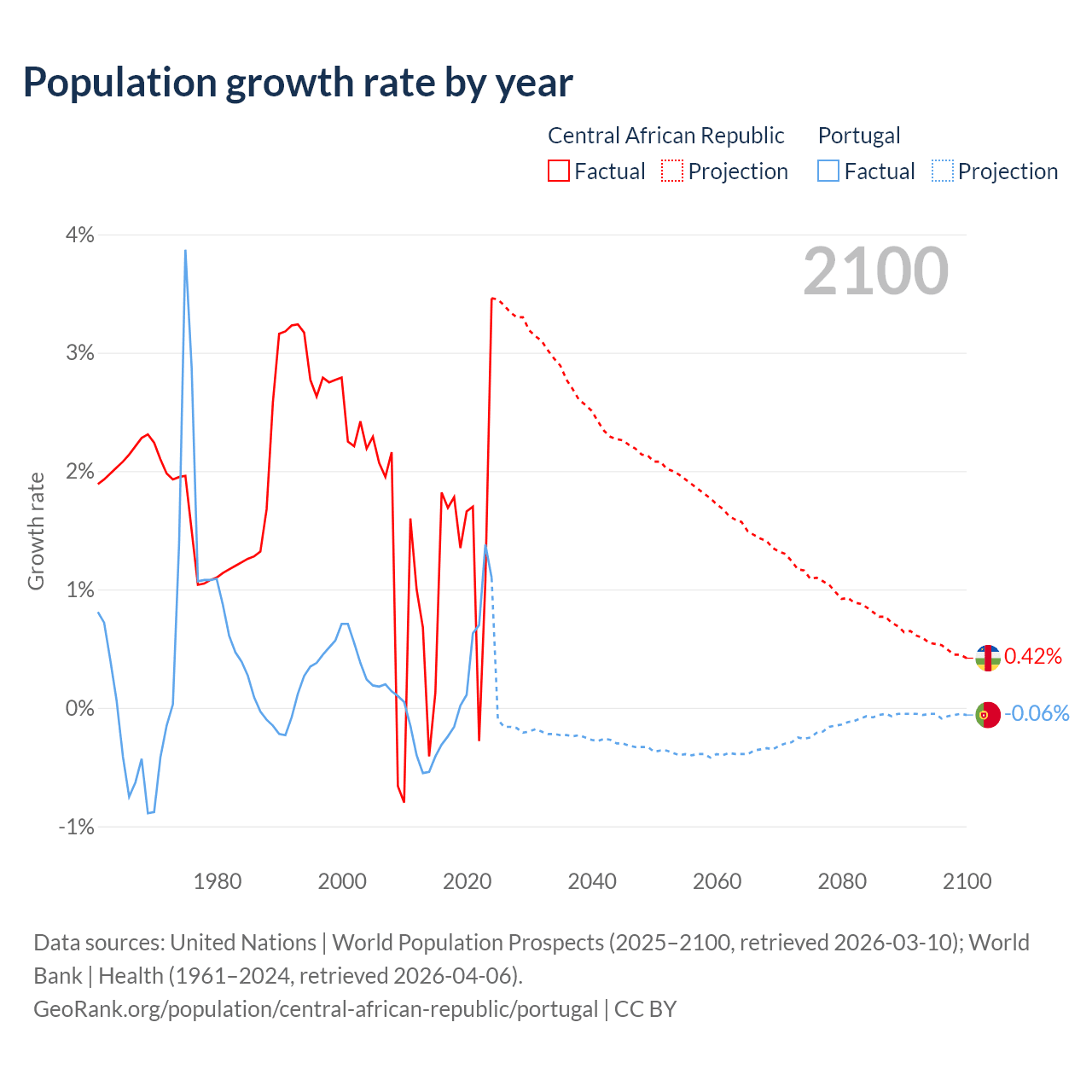 - For the last 10 years, the Central African Republic has had an average growth rate of +1.27% per year vs +0.21% in Portugal.