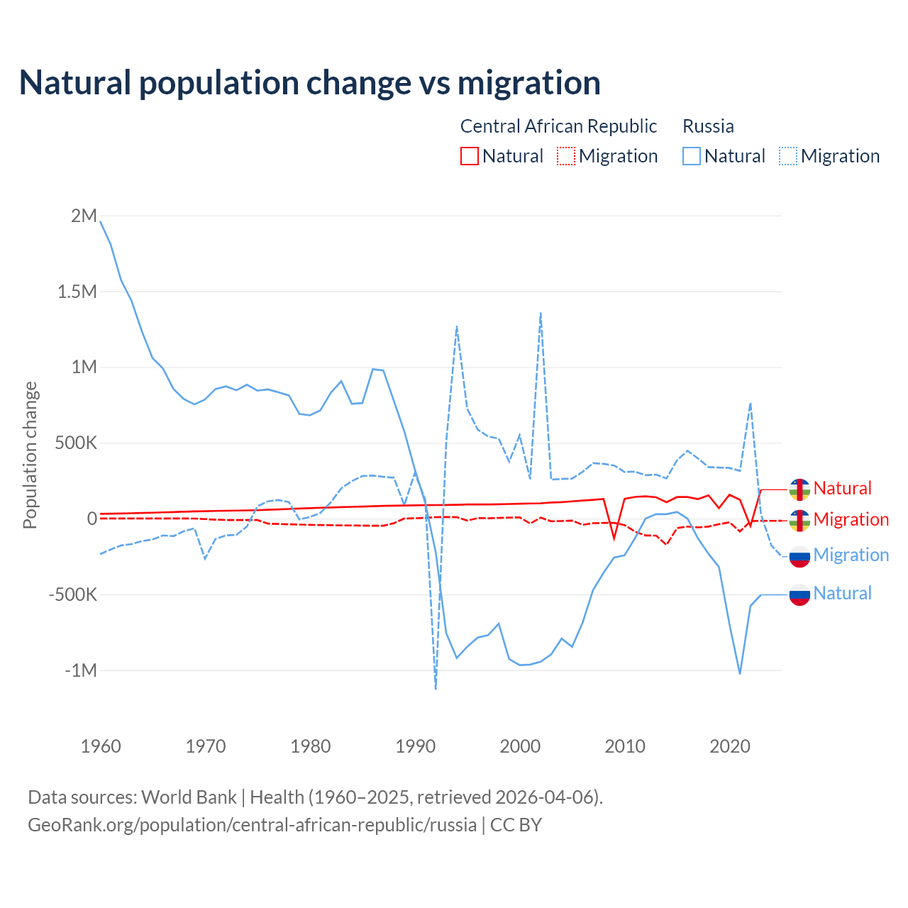 Over the last 10 years, 66.7% of the population change in the Central African Republic is from natural causes (a gain of 1,164,312 people) and 33.3% is from migration (a loss of 580,593 people). In Russia 48.6% is from natural causes (a loss of 3,416,377 people) and 51.4% is from migration (a gain of 3,611,826 people).
