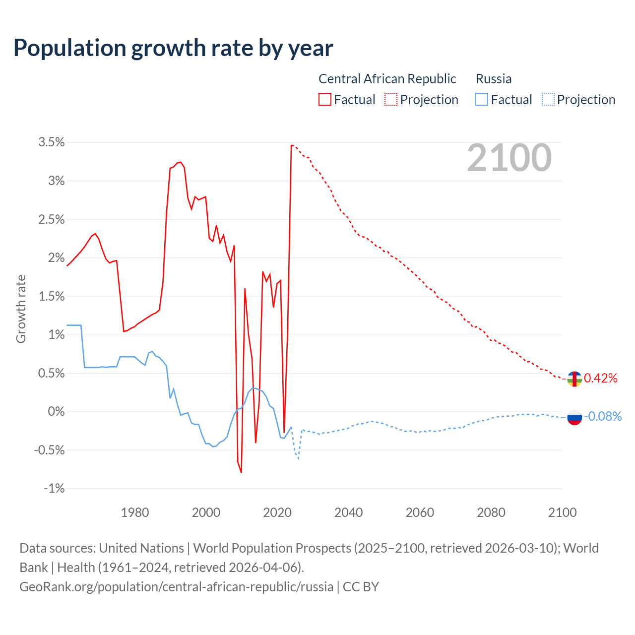- For the last 10 years, the Central African Republic has had an average growth rate of +1.27% per year vs -0.02% in Russia.