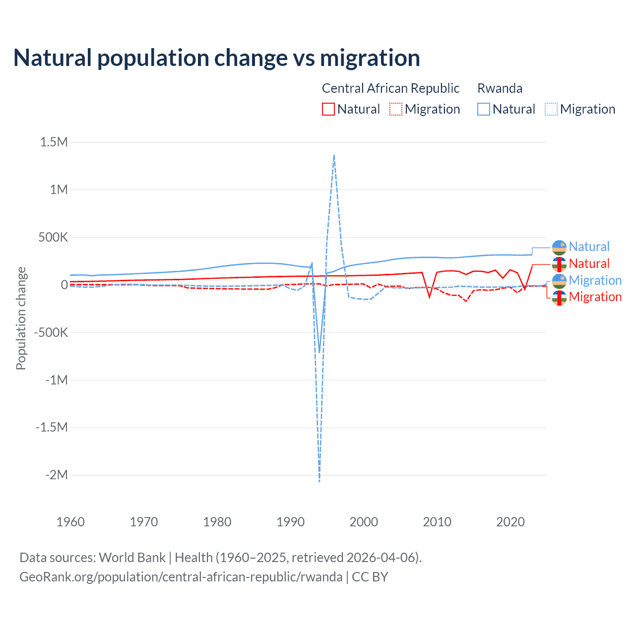 Over the last 10 years, 66.7% of the population change in the Central African Republic is from natural causes (a gain of 1,164,312 people) and 33.3% is from migration (a loss of 580,593 people). In Rwanda 93.8% is from natural causes (a gain of 3,081,296 people) and 6.18% is from migration (a loss of 203,035 people).