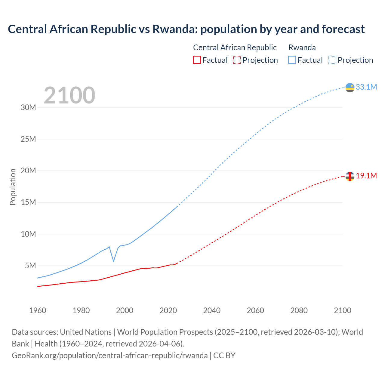 The latest officially reported population of the Central African Republic was 5,330,690 in 2024 vs 14,256,567 people in Rwanda in 2024. In 2026, based on the adjusted UN estimation, the current Central African Republic's population is 5,753,659 people compared to 14,975,051 in Rwanda.