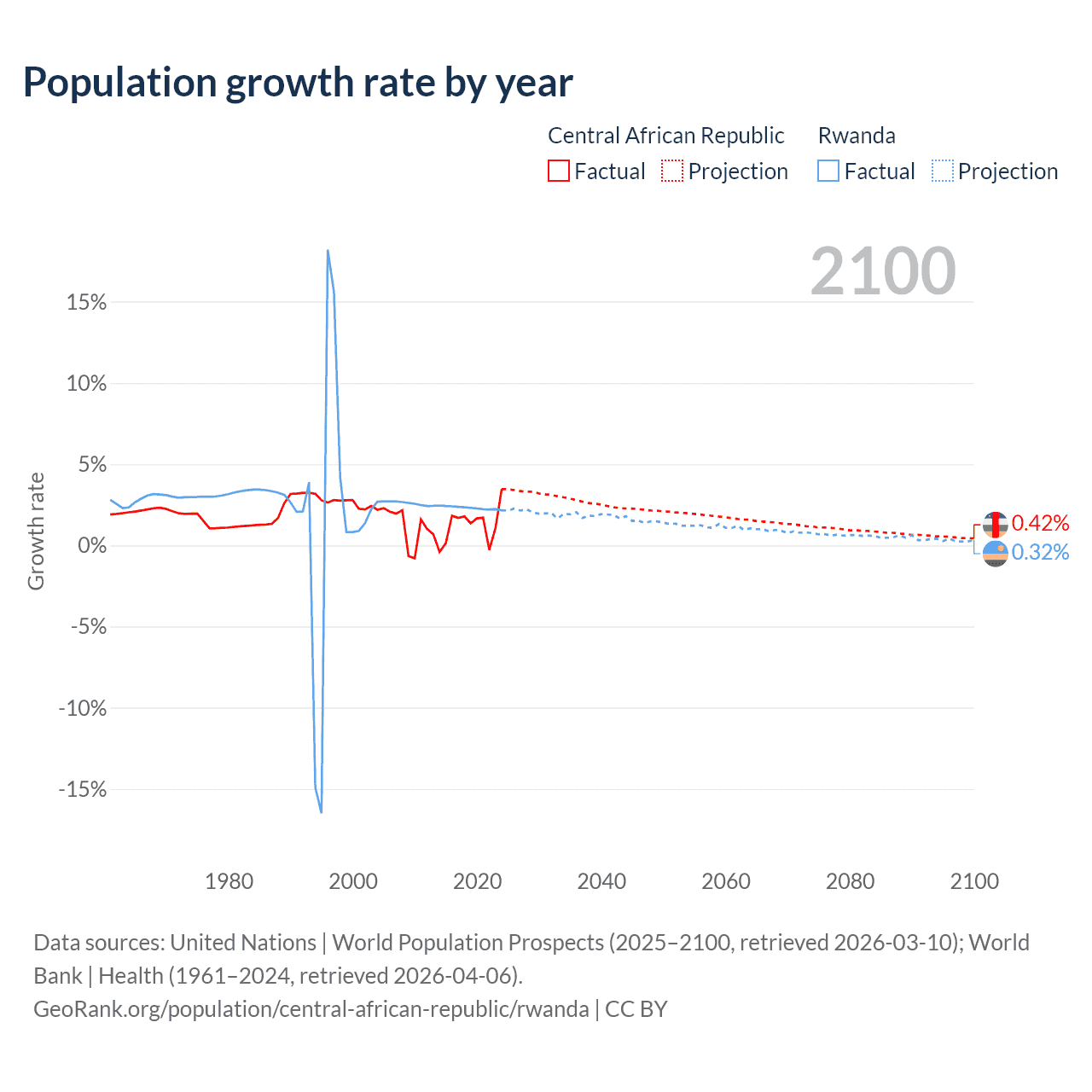 - For the last 10 years, the Central African Republic has had an average growth rate of +1.27% per year vs +2.31% in Rwanda.