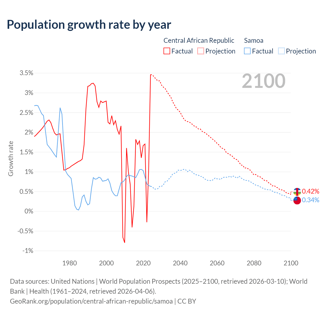 - For the last 10 years, the Central African Republic has had an average growth rate of +1.27% per year vs +0.87% in Samoa.