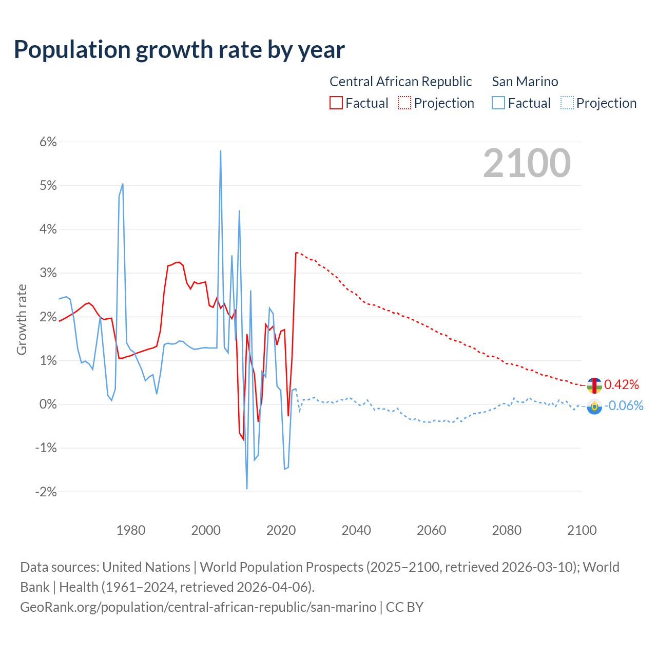 Data sources: World Bank | Health (1960–2024, retrieved 2026-04-06); United Nations | World Population Prospects (1960–2026, retrieved 2026-03-10); U.S. Census Bureau (1960–2025, retrieved 2026-02-08); Central Intelligence Agency (CIA) (2000–2019, retrieved 2026-02-20).
